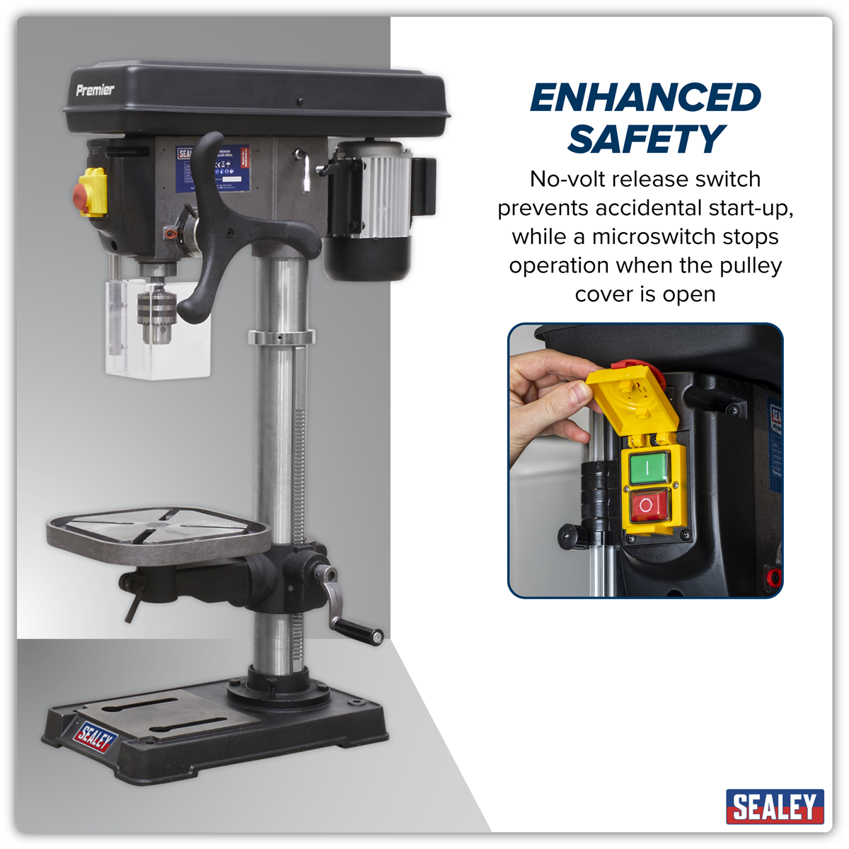 560.95 2026-04-24One of a comprehensive range of Premier bench mounting pillar drills for the professional workshop. Features heavy-duty aluminium-bodied motor for long and reliable performance. No-volt release switch to prevent inadvertent start-up and pulley cover protected by microswitch to prevent drill operating when cover is open. Fitted with an integral work light which illuminates the drilling table giving operator a clear view of the drilling process (bulb not included). Supplied with an electrically inter-locked chuck guard. Large sized square table fitted with precision rack and pinion height adjustment.