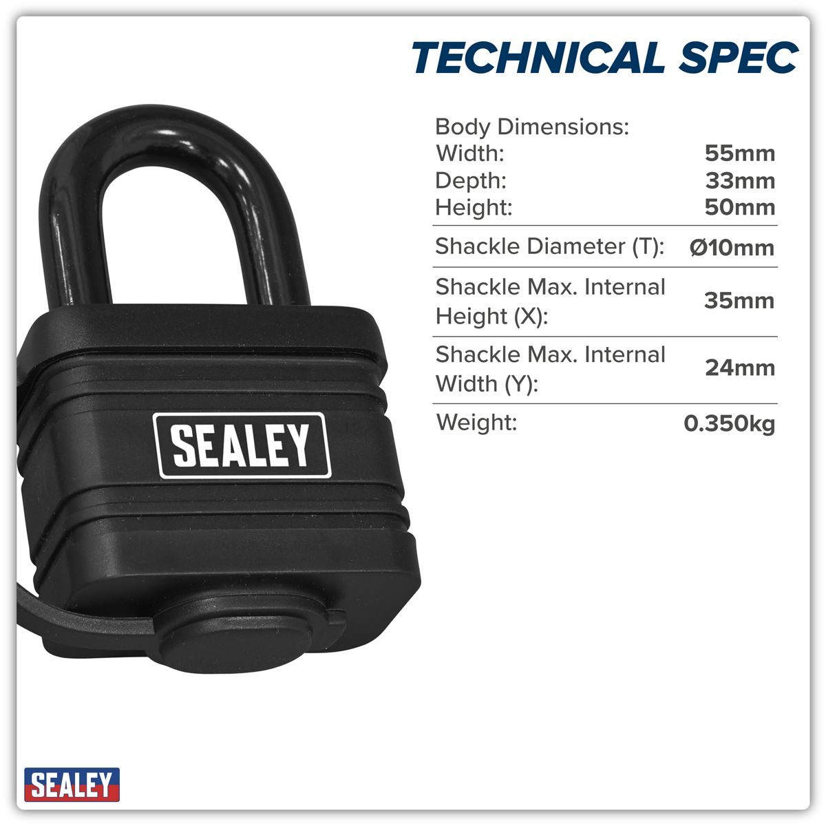 13.78 2026-03-27Weatherproof padlock with composite coated laminated steel body and hardened steel shackle. Features precision pin tumbler brass cylinder. Ideal for outdoor use. Supplied with two keys.