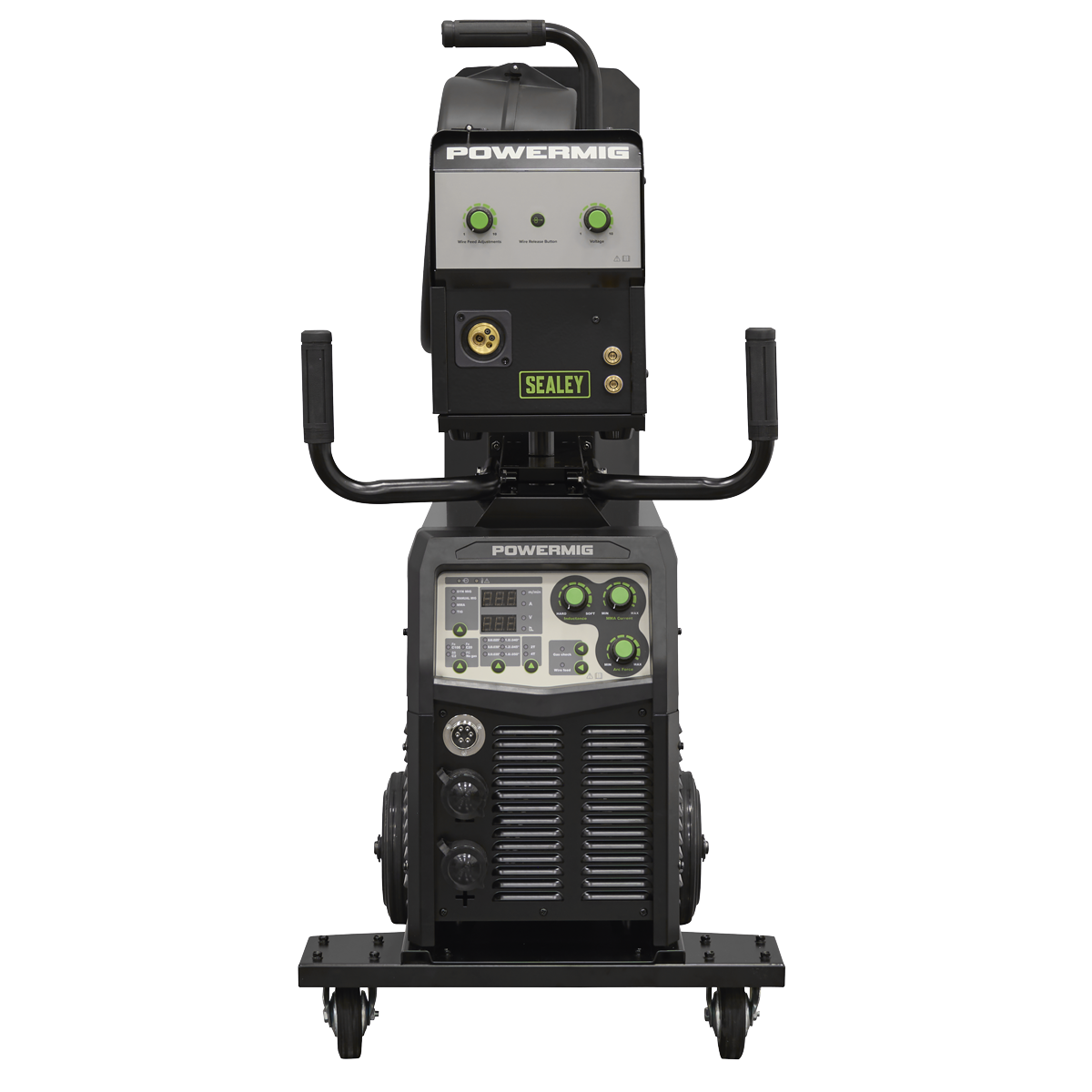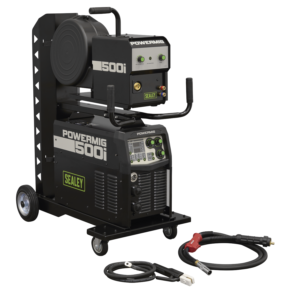 2039.95 2026-01-24Multi process IGBT inverter Gas/Gasless MIG/TIG/MMA welder suitable for professional fabricators and workshops, as well as mechanics and technicians. Equipped with a portable wire feeder enabling access into high or tight spaces that would otherwise be difficult to reach. Maximum output of 500A making it ideal for welding a large variety of metals including steel, stainless steel up to 20mm. 2T/4T torch trigger function allowing greater precision during longer welds. Features short circuit, over-heating and over-current protection. Supplied with 2m power cable, 2m earth clamp, 3m Euro non-live MIG torch and 2m Electrode holder. Wire capacity of 5-15kg with a diameter of 0.6mm to 1.6mm. Electrode capacity from 1.6mm to 5mm. Duty Cycle: MIG 60% @ 500A, MMA 60% @ 500A, TIG 60% @ 500A. POWERMIG500Wi is also supplied with a water cooler to prolong duty cycle and efficiency.
