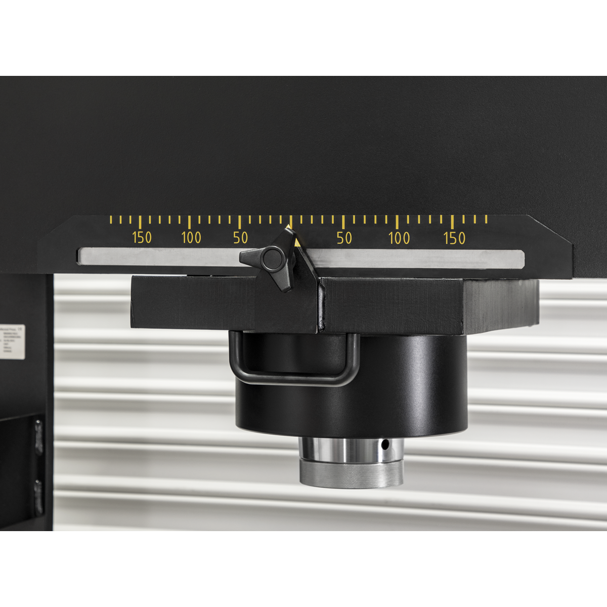 5351.95 2025-12-01Heavy-duty steel frame construction with integral air motor powering hydraulic pump unit. Adjustable work area with removable tray. Sliding hydraulic ram assembly giving 360mm of lateral travel for off-centre pressing applications. Frame head fitted with ram pressure gauge. Winch assisted press table adjustment. Storage for press pins included in frame (pins not included). Supplied with flat pressing plate/V-blocks. This item is heavy. Extra assistance must be provided at the delivery point to help its safe delivery.