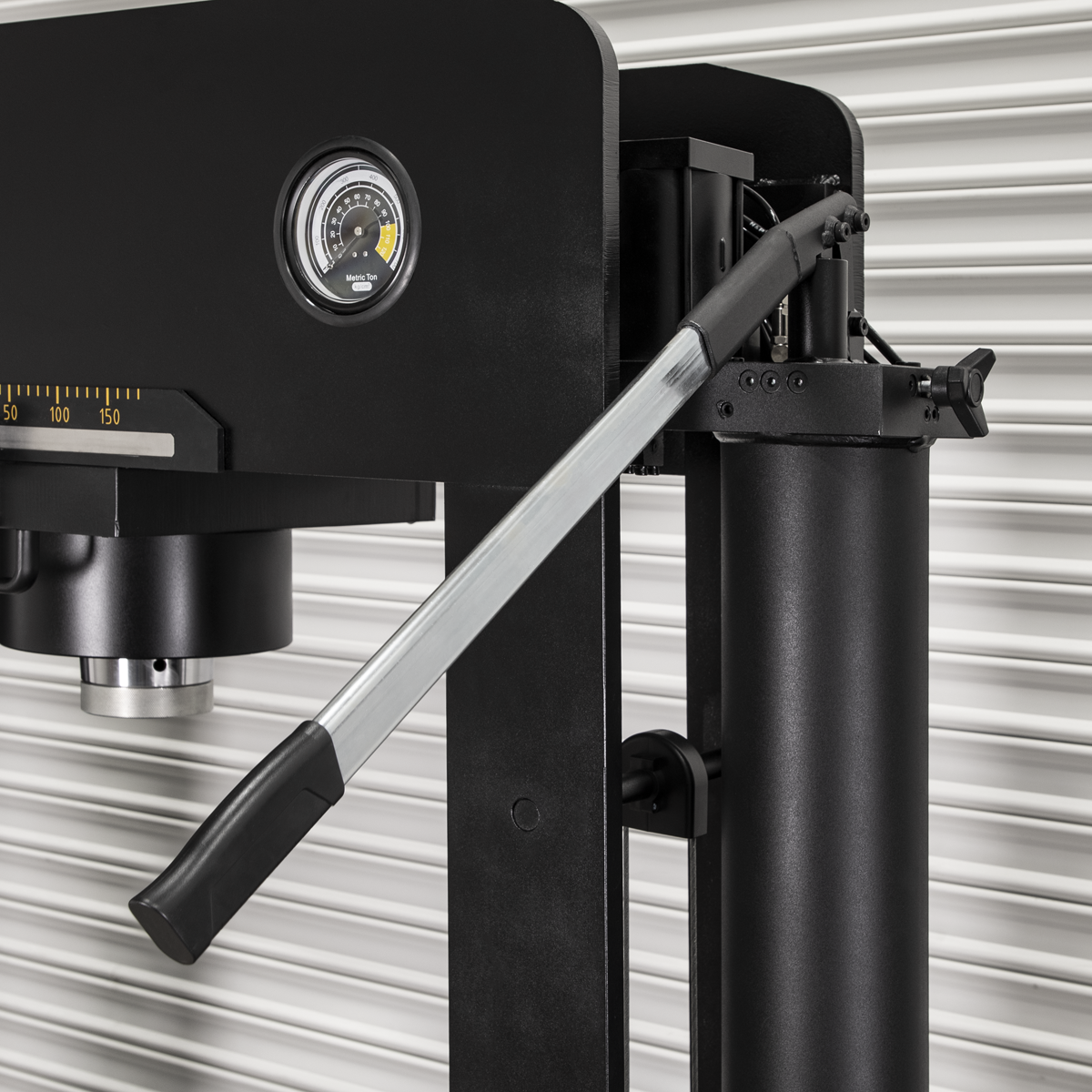 5351.95 2026-01-18Heavy-duty steel frame construction with integral air motor powering hydraulic pump unit. Adjustable work area with removable tray. Sliding hydraulic ram assembly giving 360mm of lateral travel for off-centre pressing applications. Frame head fitted with ram pressure gauge. Winch assisted press table adjustment. Storage for press pins included in frame (pins not included). Supplied with flat pressing plate/V-blocks. This item is heavy. Extra assistance must be provided at the delivery point to help its safe delivery.
