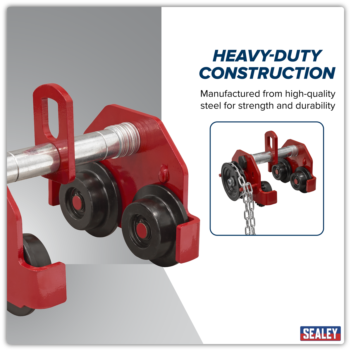 93.56 2025-12-11Manufactured from high-quality steel for strength and durability. Powder-coated for long-lasting protection. Suitable for use with chain blocks, lever hoists and other lifting gear. Designed for mounting onto various widths of I-beam or RSJ. Includes anti-drop plates for added security.