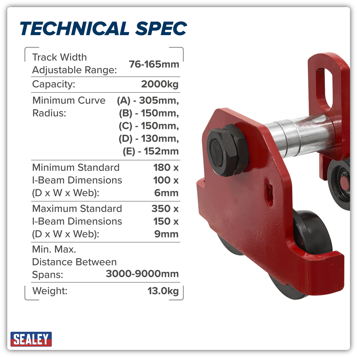 135.56 2026-01-24Suitable for use with our lever hoists or chain blocks. Designed for mounting onto an I-beam or RSJ to allow load to be manoeuvred sideways. Track width adjusts between 80-168mm. Incorporates wheel guards to prevent contact with other trolleys mounted on same load bearer. Four evenly spaced wheels help to make the unit move smoothly along the load bearer.