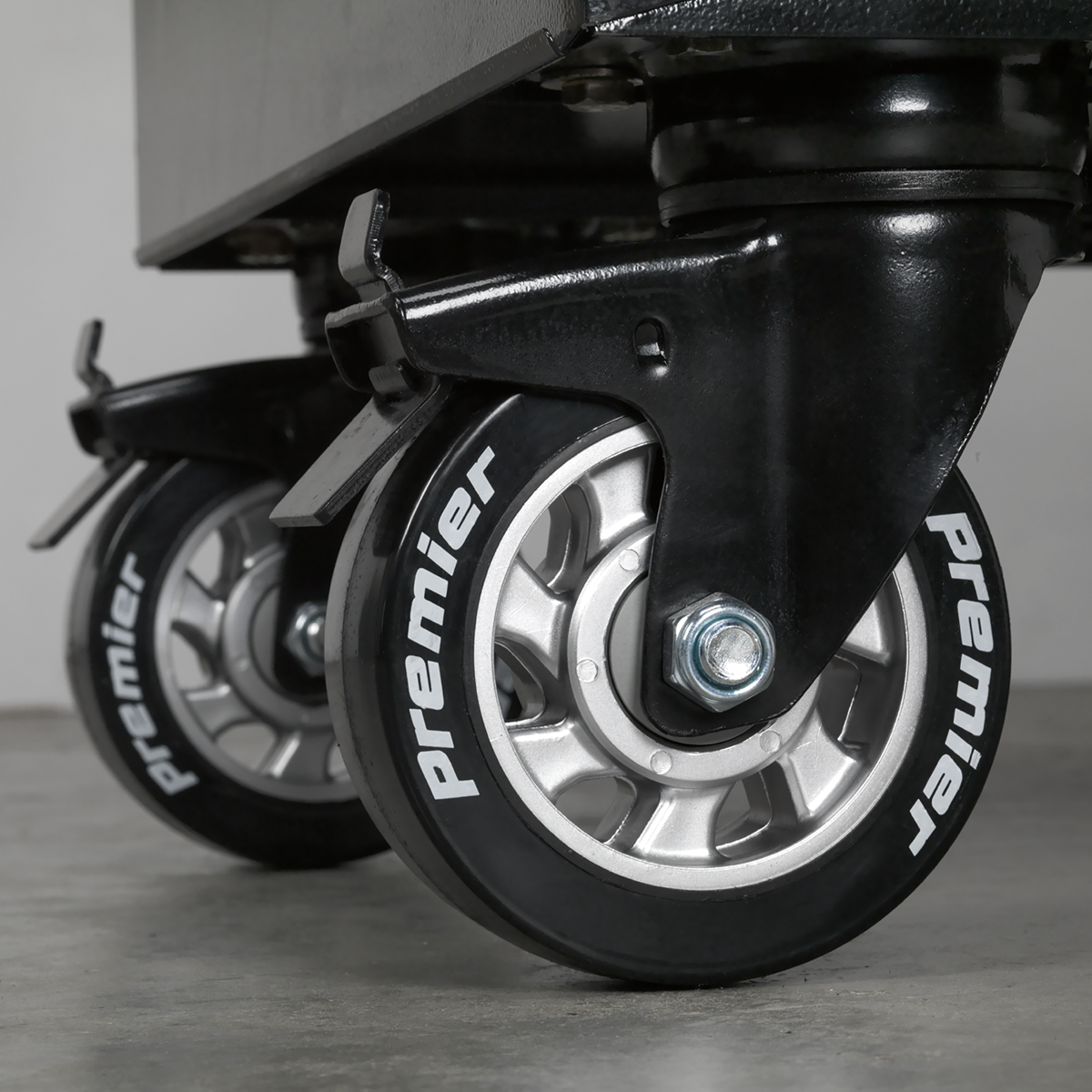 1289.95 2025-11-12Heavy-duty welded steel construction for strength and durability. Textured powder coat finish. Ball-bearing drawer slides provide superior performance and carry heavier loads, double sets on large drawers. All drawers have full width sand blasted aluminium 'Lift & Latch' drawer pulls, making easy-access while preventing inadvertent opening when box is being moved. Tubular chrome plated exterior side handle. Non-slip drawer liners supplied for all drawers. Heavy-duty Ø125mm Mag style castors, four swivel with toe brakes and two fixed on rollcabs. Integral locking system locks all drawers with the turn of one key. Supplied with two keys. Supplied with 12mm PVC coated MDF worktop for use as a workbench when not used with a topchest. Use with Model No. PTB141507 Topchest or as a standalone unit.
