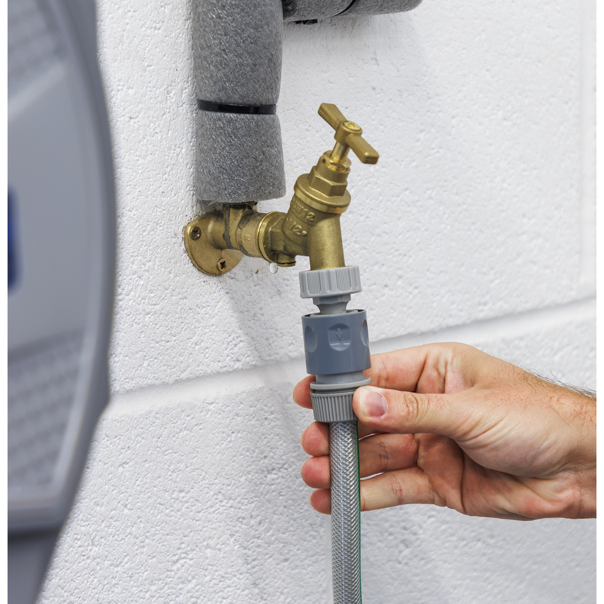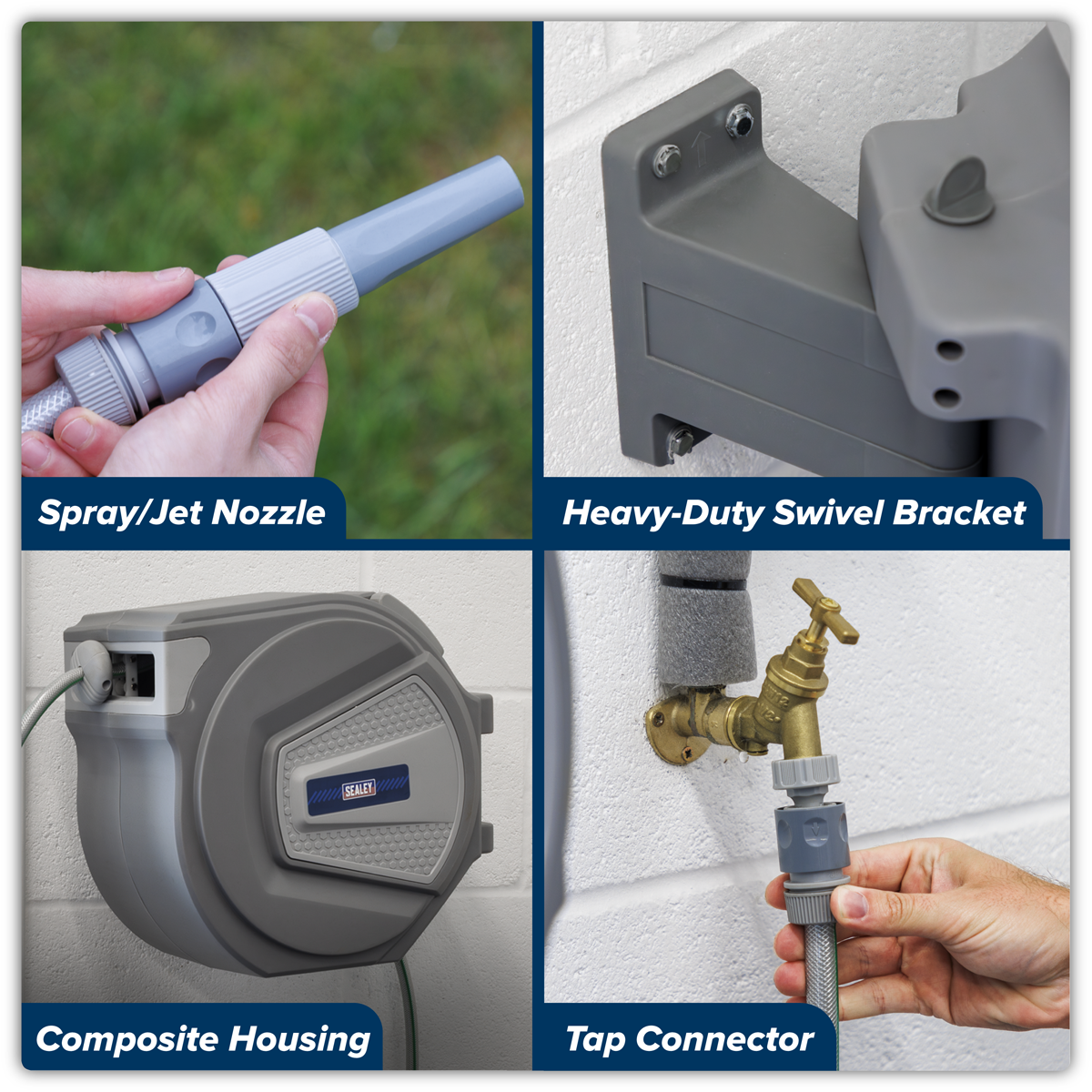 186.86 2025-11-11Composite housing with heavy-duty wall mounting swivel bracket. Fitted with 30m Ø13mm PVC garden hose with spray/jet nozzle. Hose can be extended and stopped at any length. Controlled, slow rewind which, unlike traditional retractable reels, returns the water hose at a safe speed. Auto-layering mechanism distributes water hose evenly back into reel housing preventing it from jamming. Supplied with 2m leader hose with quick coupler and tap connector.