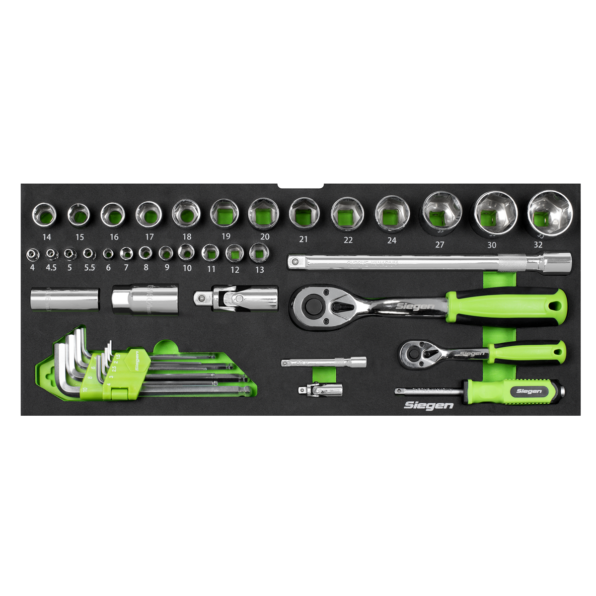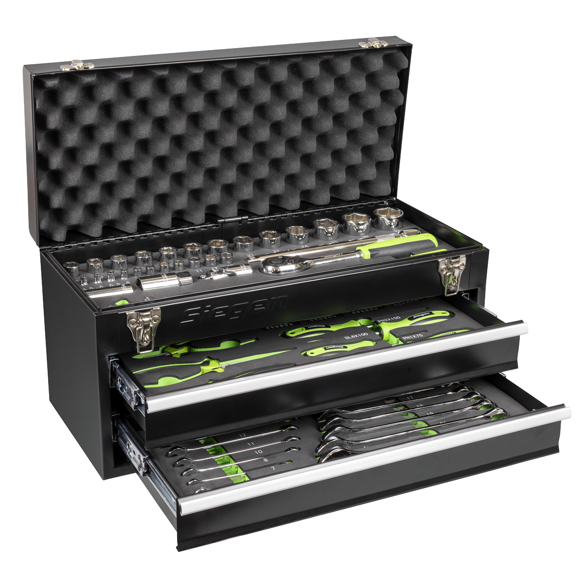 194.96 2025-11-10Comprehensive range of frequently used hand tools with 1/4" and 1/2"Sq drive reversible ratchet wrenches. Includes 1/4" and 1/2"Sq drive sockets, hex keys, combination spanners, screwdrivers, bit set and accessories. Tools feature soft grip handles for comfort and control. Supplied in a sturdy, fully portable metal tool chest with EVA foam storage trays.