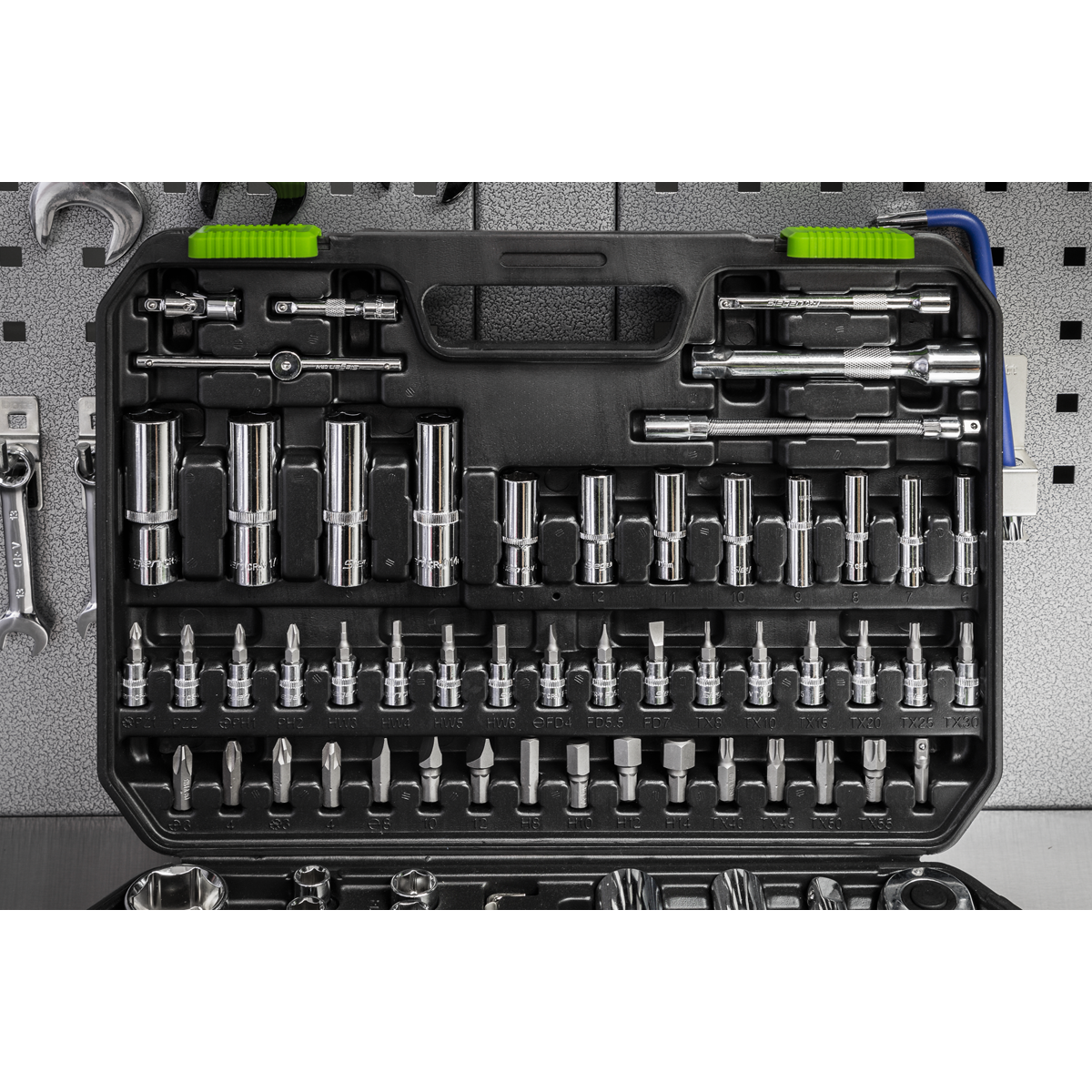 97.16 2026-05-27Professional socket set manufactured from hardened and heat treated Chrome Vanadium steel. Fully polished with a mirror finish. Covers sizes from 4 to 32mm. Includes 72-tooth comfort grip ratchet wrenches, spark plug sockets, extension bars, socket bits, bits, spinner handle and accessories. Supplied in storage case. Contents: 1/4"Sq Drive Standard Sockets; 4-14mm, 1/4"Sq Drive Deep Sockets; 6-13mm, 1/4"Sq Drive Socket Bits; T8-T30, Phillips - #1, #2, Pozi - #1,#2, Slotted - 4-7mm, Hex - 3-6mm, 1/4"Sq Drive Extension Bars; 50, 100mm, 1/4" Drive Flexible Extension, 1/4"Sq Drive Ratchet Wrench, 1/2"Sq Drive Standard Sockets; 10-32mm, 1/2"Sq Drive Deep Sockets; 14-19mm, 8mm Hex Bits; TRX-Star* - T40-T55, Phillips - #3, #4, Pozi - #3, #4, Slotted - 8-12mm, Hex - 8-14mm, 1/2"Sq Drive Spark Plug Sockets; 16, 21mm, 1/2"Sq Drive Extension Bars; 125, 250mm, 1/2"Sq Drive Ratchet Wrench, 1/4" and 1/2"Sq Drive Universal Joints, 1/4"Sq Drive Spinner Handle, 1/4"Sq Drive Sliding T-Bar, 1/2"Sq Drive T-Bar Adaptor, 8mm Hex Bit Adaptor, Hex Keys; 1.5-2.5mm.