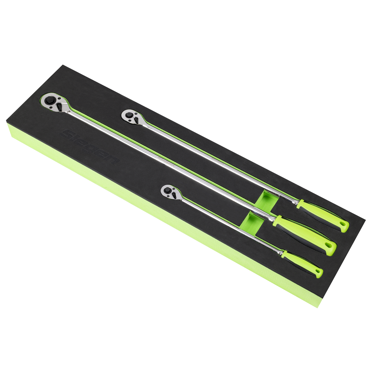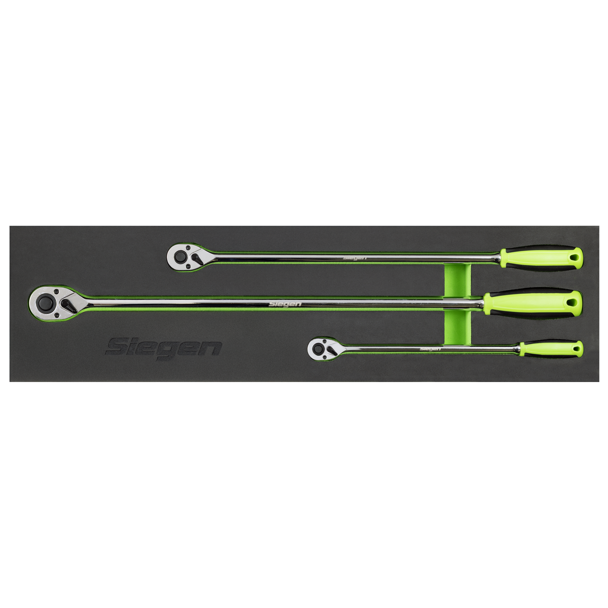 52.76 2026-05-17Chrome Vanadium steel 72-tooth ratchet wrench set, hardened and tempered, with a fully polished mirror finish. Features pear-head with flip reverse, push-button quick release and anti-slip comfort grip. Includes 1/4", 3/8" and 1/2" drive ratchet wrenches. Supplied in EVA foam storage tray. Note: These tools are manufactured in accordance with DIN standards and are designed for improved access, not excessive torque. Misuse will invalidate guarantee.