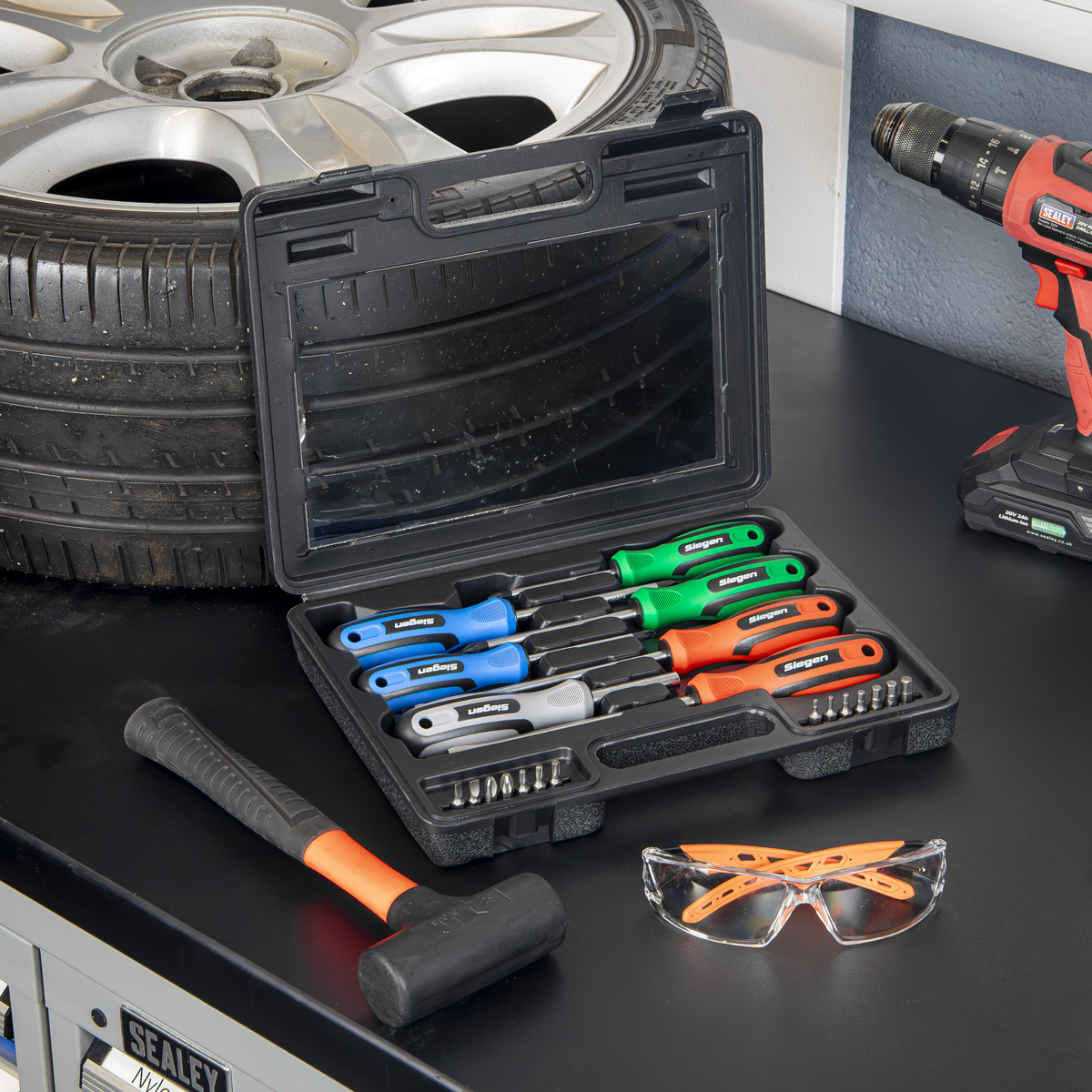 17.38 2026-02-19Selection of popular sized screwdrivers, bit driver and bits. Chrome Vanadium steel satin finish shafts with shot blasted and magnetized tips. Contoured soft grip handles with colour-coding for fast identification. Supplied in storage case.