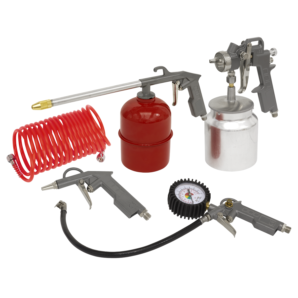 43.92 2026-04-13Air tools and accessories suitable for all leading makes of compressor. Includes high performance suction feed spray gun with composite bayonet type pot lid, tyre inflator with gauge, paraffin/detergent spray gun, air blow gun and coiled air hose. Components are fitted with 1/4"BSP threaded unions. Also available individually, see below.