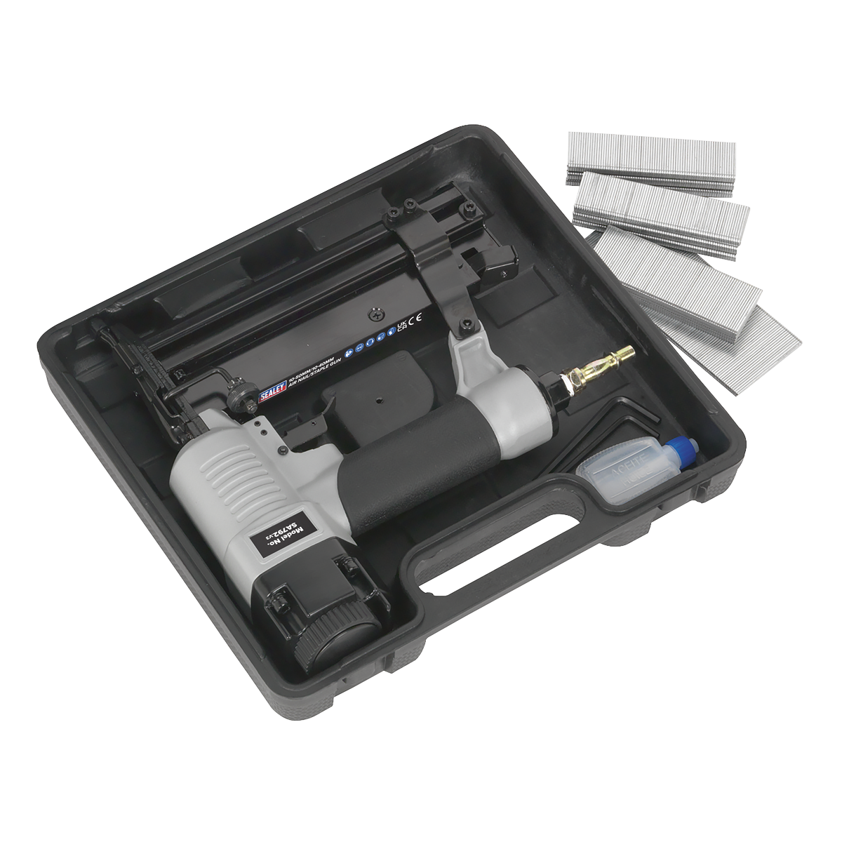 65.96 2026-01-11Professional air nailer/stapler with lightweight aluminium body and rubber grip handle. Safety trigger device to prevent accidental firing of nails and staples. Supplied in storage case with oiler and starter pack of nails and staples.