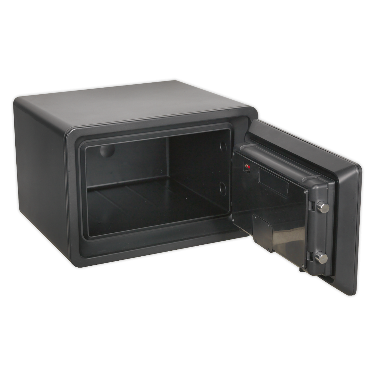 230.36 2025-12-02Heavy-duty ABS shell with a four bolt, door locking mechanism. Double wall filled with cellular concrete. Electronic panel with LCD screen, accepts thousands of 6-digit codes. Also supplied with two emergency override keys. Offers up to 1hr fire resistance with UL approval. Batteries not included.