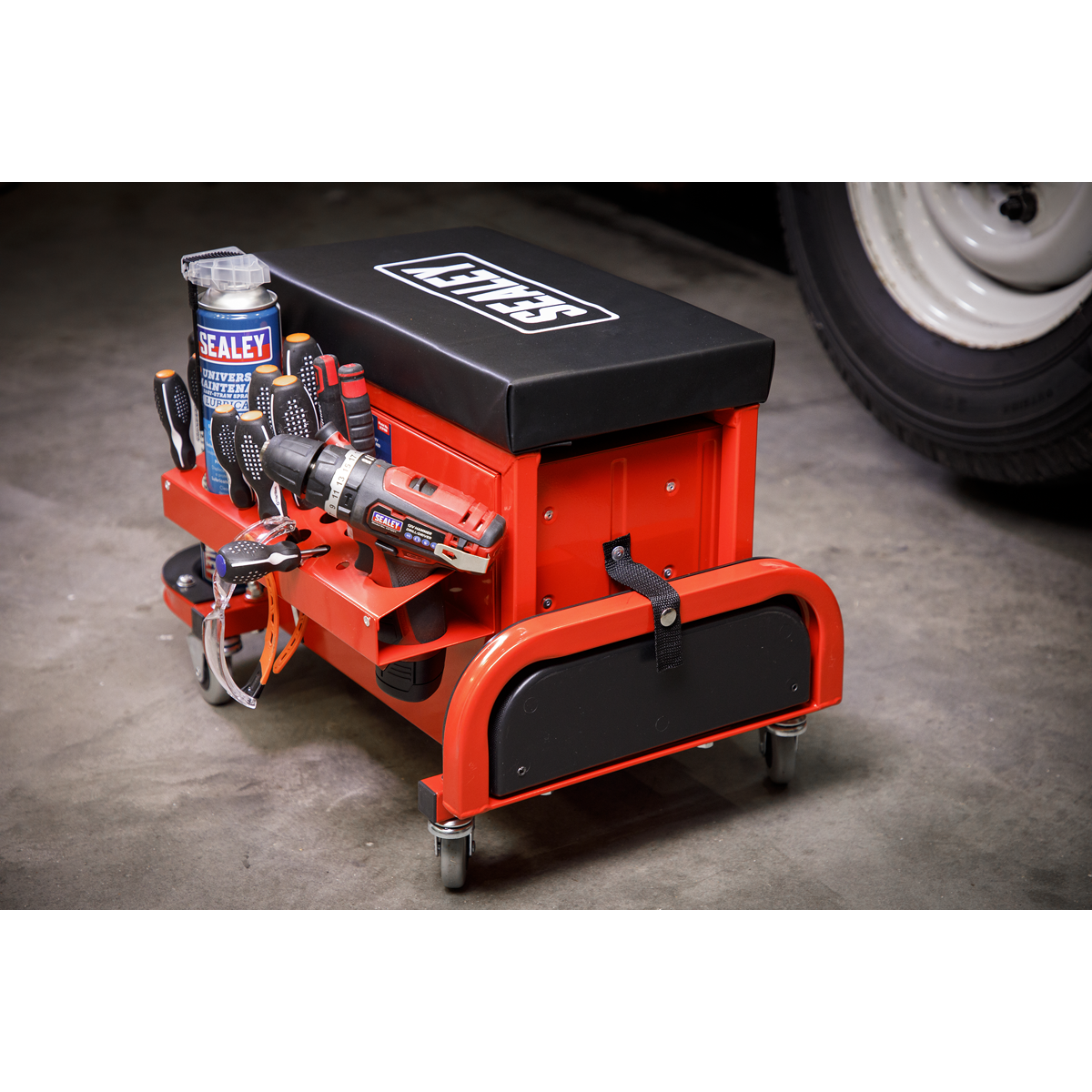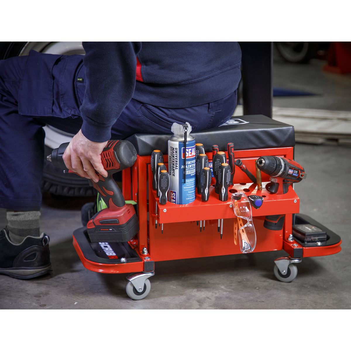 130.45 2025-12-12Mobile utility seat and toolbox solution for keeping commonly used tools to hand. Features two folding side trays for storing nuts and bolts during use. Twin can capacity drinks holder and screwdriver storage rack on the rear. Four Ø60mm oil resistant swivel castors for easy manoeuvrability. Thick vinyl padded seat for added comfort. Suitable for the professional workshop.