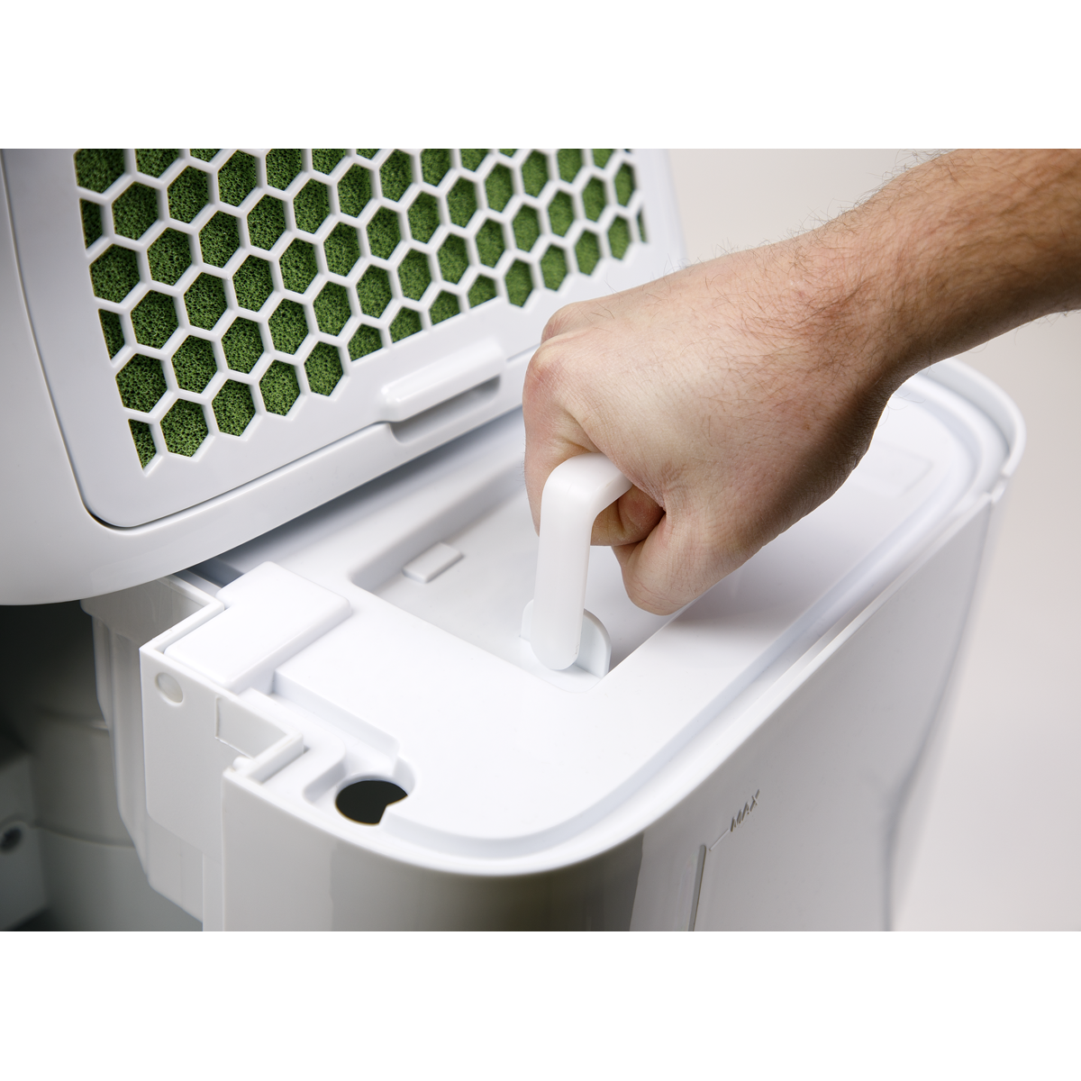 234.55 2025-12-22Compact, efficient and portable unit that extracts up to 20L of water per day. Removes excess moisture from air to prevent build-up of mildew and mould. Indicator light on front panel changes colour to show current humidity level in room. Touchscreen control panel allows the user to select the mode, set the desired humidity level and a timer ranging from 1-24hr. Laundry mode function accelerates the drying cycle allowing you to dry clothes quicker and effectively eliminate odours. Safely turns off automatically when tank is full. Refrigerant is environmentally friendly R290. Supplied with a 300mm drain hose for continuous operation along with four swivel wheels allowing the unit to be easily manoeuvred.
