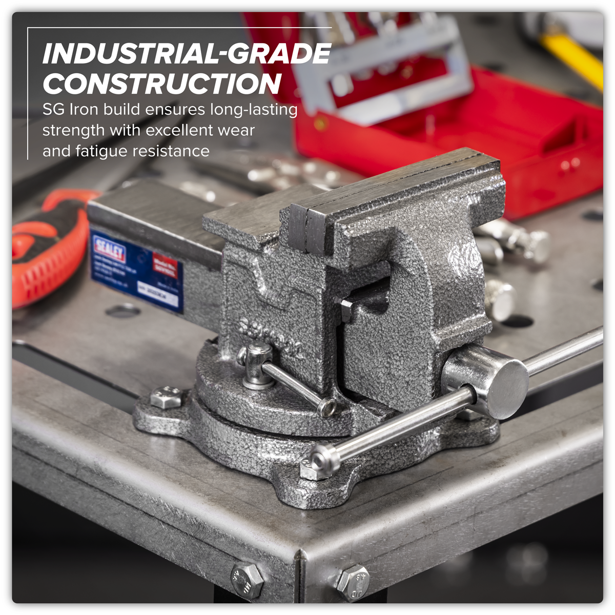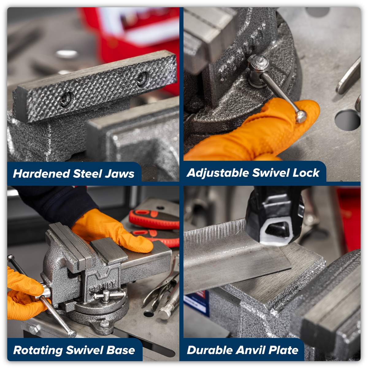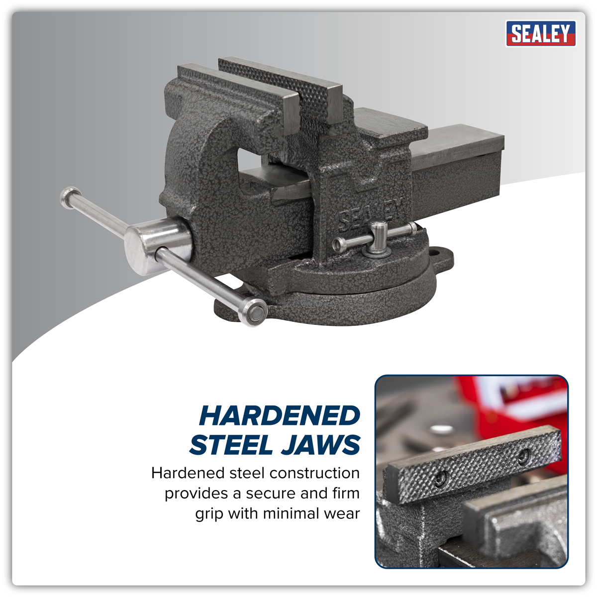 26.05 2026-05-06Made with SG Iron for a stronger, more durable, high strength, and impact resistance Vice. Swivel base provides greater flexibility and convenience when working on a piece from multiple directions without needing to reposition the workpiece itself. 100mm Hardened steel jaws for gripping materials securely. Three mounting holes on the base provide secure fitting to a workbench (fixings not included). A flat anvil surface on the back of the vice for hammering or shaping. Ideal for metalwork, woodwork and DIY repair tasks.