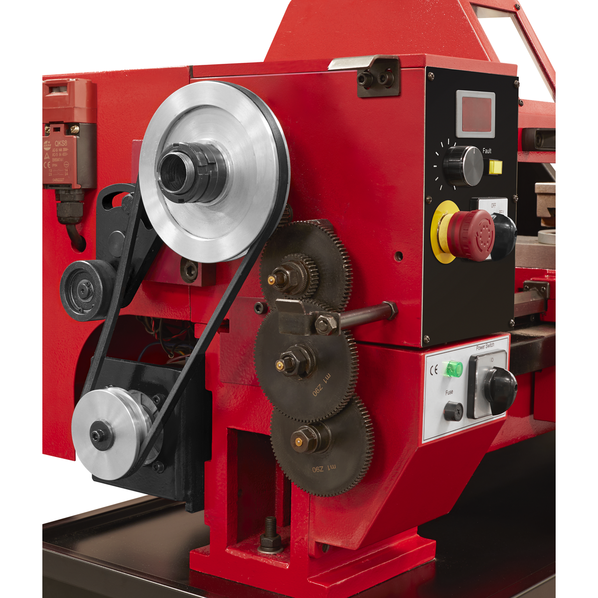 2543.95 2026-02-01Quality workshop lathe suitable for a wide range of turning and drilling applications; includes floor stand. Features power feed for even surface finish and thread cutting. Four-way tool post mounted on compound slide mechanism enables fast interchange of cutting tools with accurate feed. Powered by 550W motor through six-speed gearbox. Incorporates quiet running PTO gearbox with oil bath lubrication for power feed. Supplied with three-jaw chuck and dead centre. Fitted with no-load voltage release switch. Fully guarded to CE safety of machinery directives and covered by EMC directive and Low Voltage directive. Floor stand includes suds tray and two latched door storage cabinets with shelves. It is made from welded steel with heavy-duty feet making it incredibly sturdy. • NOTE - This item is heavy. Extra assistance must be provided at the delivery point to help safe delivery.