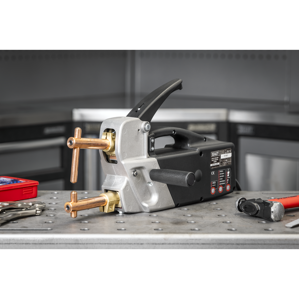 1271.95 2026-05-14Semi-automatic spot welder. Integral electronic control allows operator to select thickness of material while automatically calculating the optimum weld duration. Also features pulse mode for use on high stress steels commonly found in modern vehicle construction. All automatically selected parameters may be overridden by the operator if required. Composite casing and handle reduce heat transfer for operator comfort. Die-cast aluminium head and chassis reduces overall weight for improved handling. Fully adjustable jaw pressure from 40kg to 120kg enables close control of weld quality. Supplied with 120mm welding arms, electrodes and side handle.