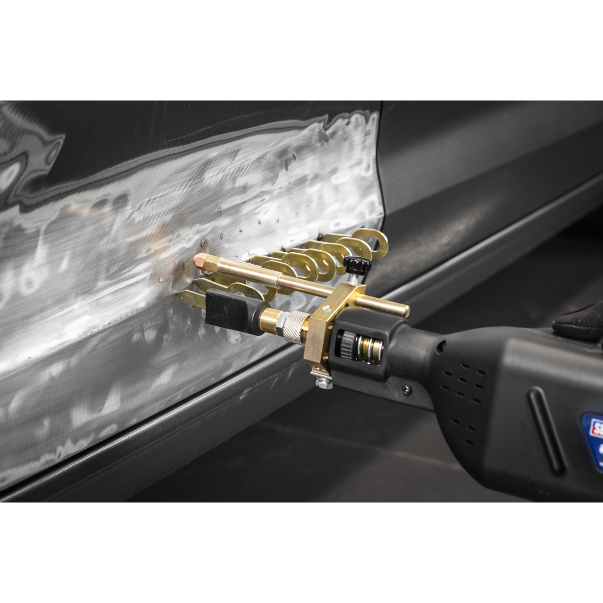811.88 2026-03-26Professional quality stud welder for fast, efficient body repairs. Removes dents quickly, without holes or the need to remove interior trim. No burn through means that removal of studs and washers is easy and preparation work before repainting is minimized. Suitable for use on steel or aluminium and can weld studs, washers and tabs. Patented quick puller attachment allows removal of smaller dents without the need for studs or washers. Supplied in heavy-duty storage case.