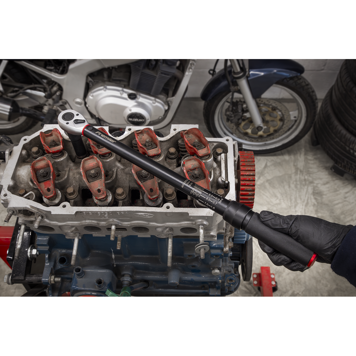 78.02 2026-02-13Flip reverse Chrome Vanadium steel ratchet head with a smooth action mechanism. Scale graduated in Nm and lb.ft. Calibration tolerance in accordance with BS EN ISO 6789-1:2017. Wrenches are individually tested to standards with ±4% accuracy and each wrench is issued with an individually numbered test certificate. Aluminium knurled handle for comfort and control. Supplied in an EVA foam storage tray.