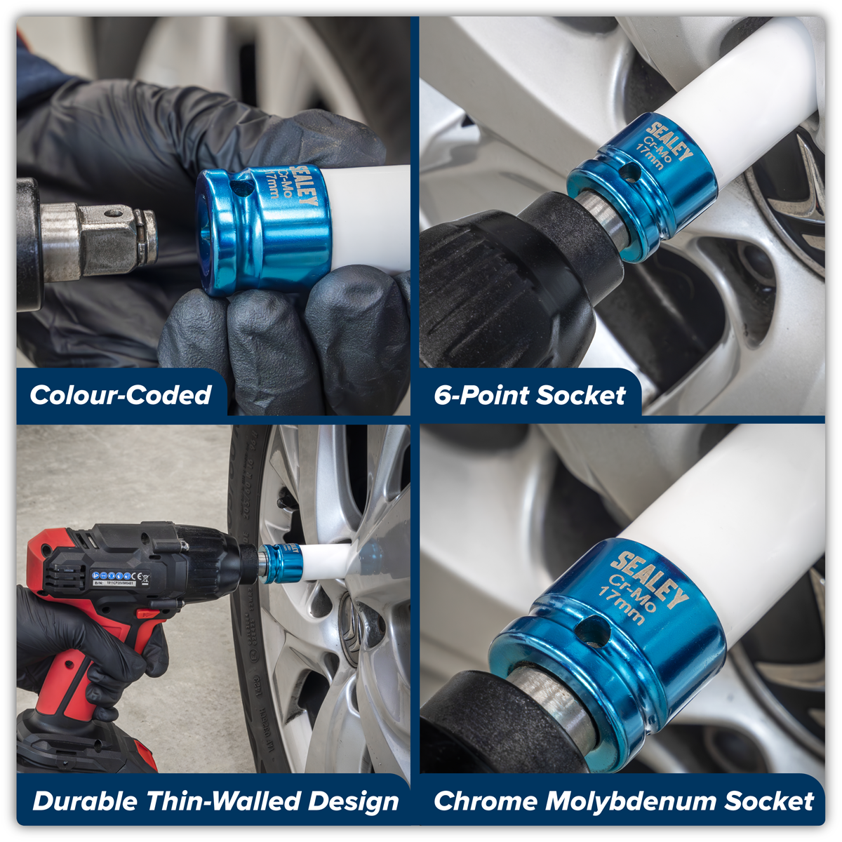 12.58 2025-12-03Chrome Molybdenum sockets, hardened, tempered and anodised for corrosion resistance. Suitable for use with impact tools. 6-Point sockets are externally and internally sleeved to prevent damage to alloy wheels and nuts. Colour-coding for ease of size selection.