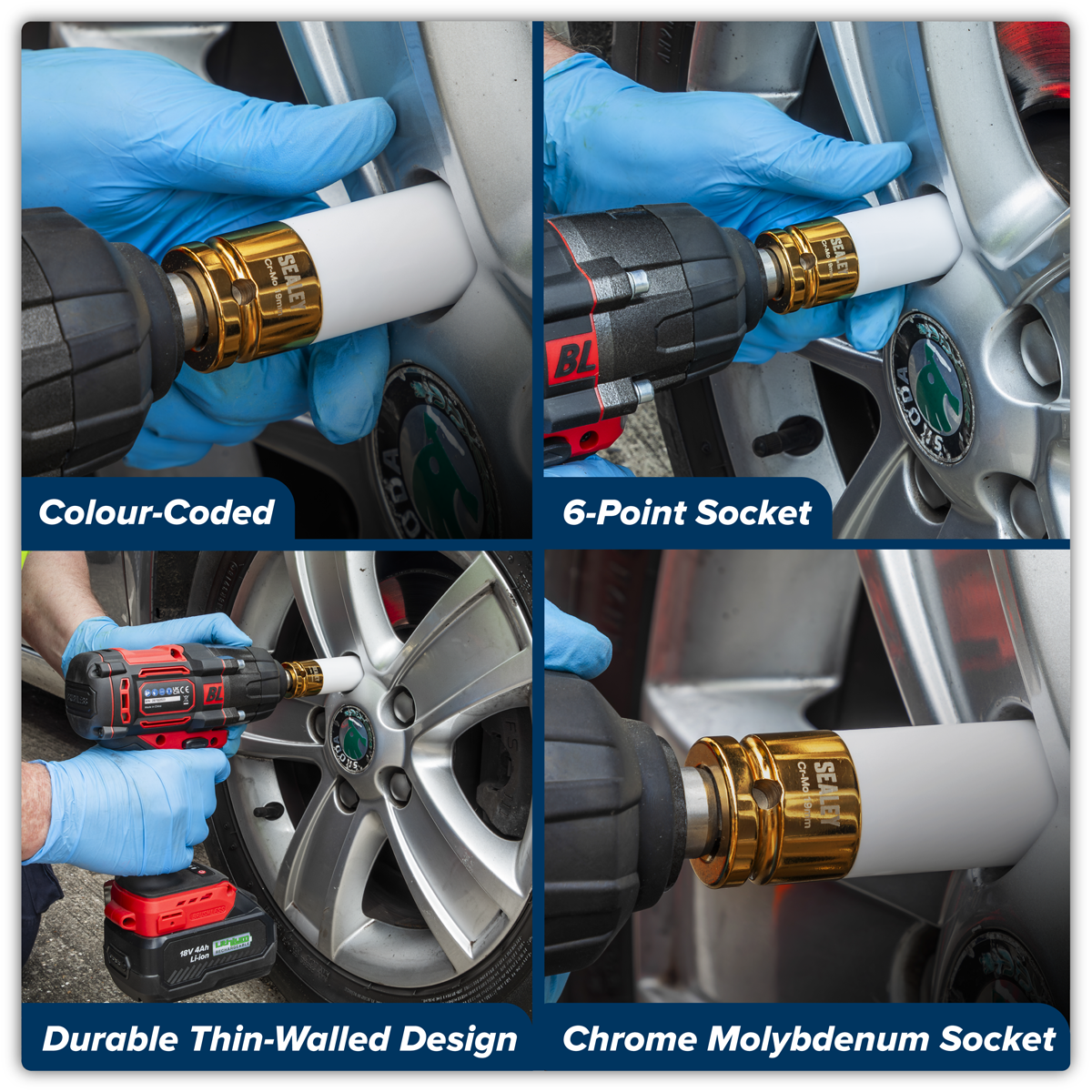 12.58 2025-12-22Chrome Molybdenum sockets, hardened, tempered and anodised for corrosion resistance. Suitable for use with impact tools. 6-Point sockets are externally and internally sleeved to prevent damage to alloy wheels and nuts. Colour-coding for ease of size selection.