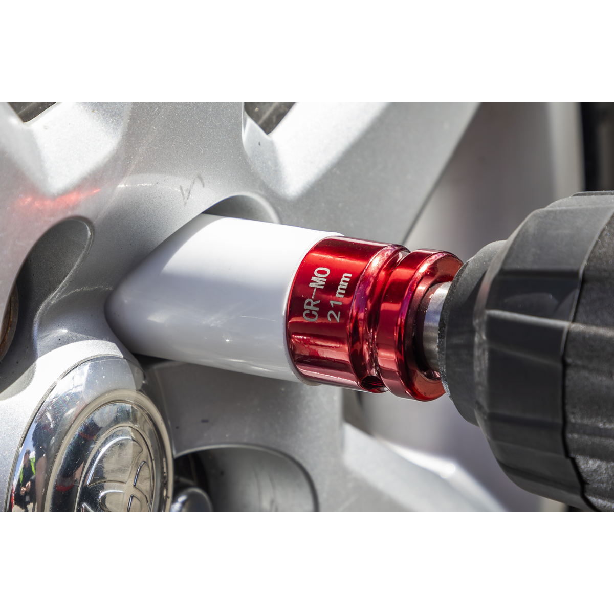 12.58 2025-11-12Chrome Molybdenum socket, hardened, tempered and anodised for corrosion resistance. Suitable for use with impact tools. 6-Point sockets are externally and internally sleeved to prevent damage to alloy wheels and nuts. Colour-coded for ease of size selection.