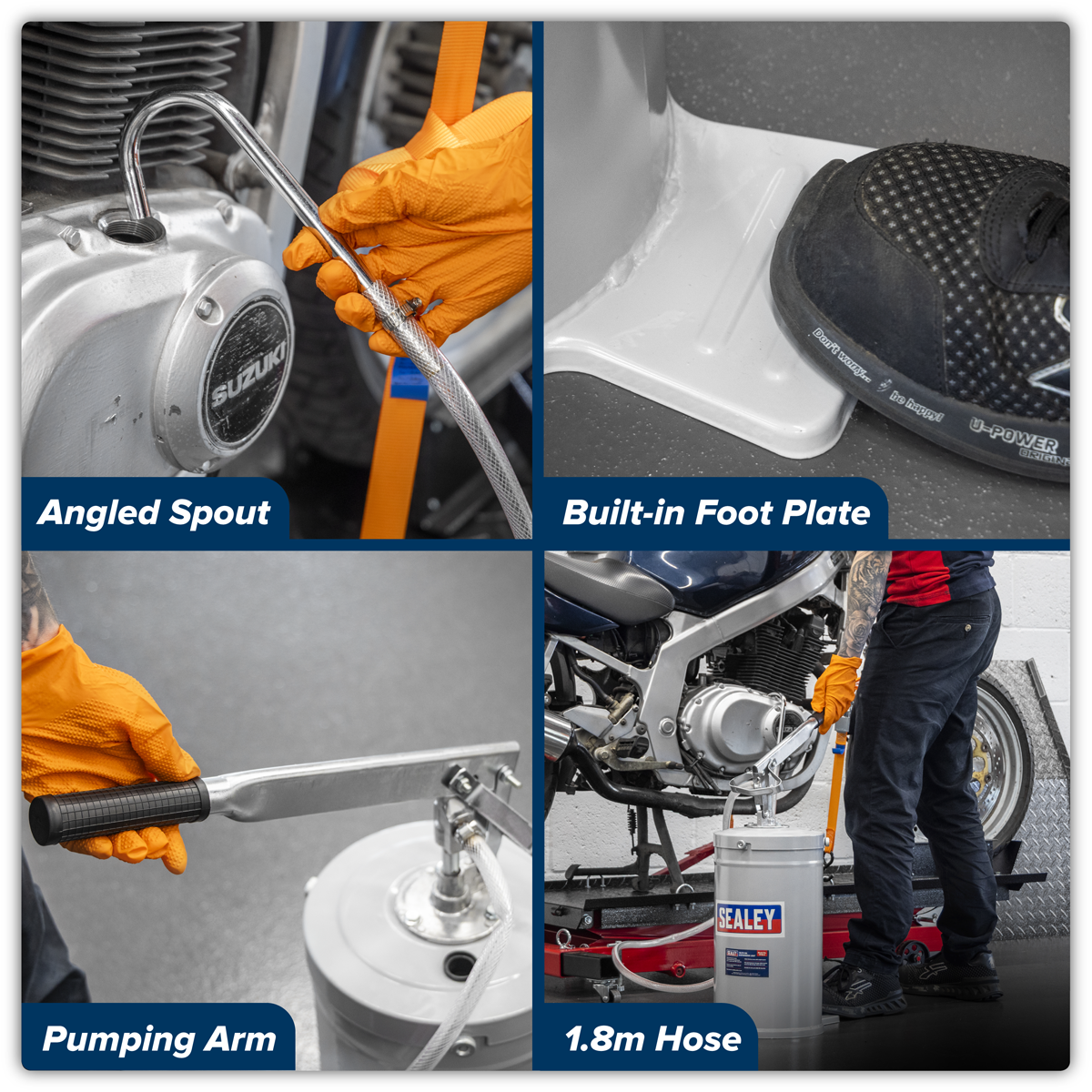 123.56 2025-12-02Self-priming lever pump manufactured from galvanized steel with 14L reservoir. Features carry handle for ease of manoeuvrability and foot plate for stability while in use. 1.8m Delivery hose with angled spout. Drip opening/spout storage within bucket cover for tidy storage when not in use. Suitable for oils up to SAE 40 viscosity.