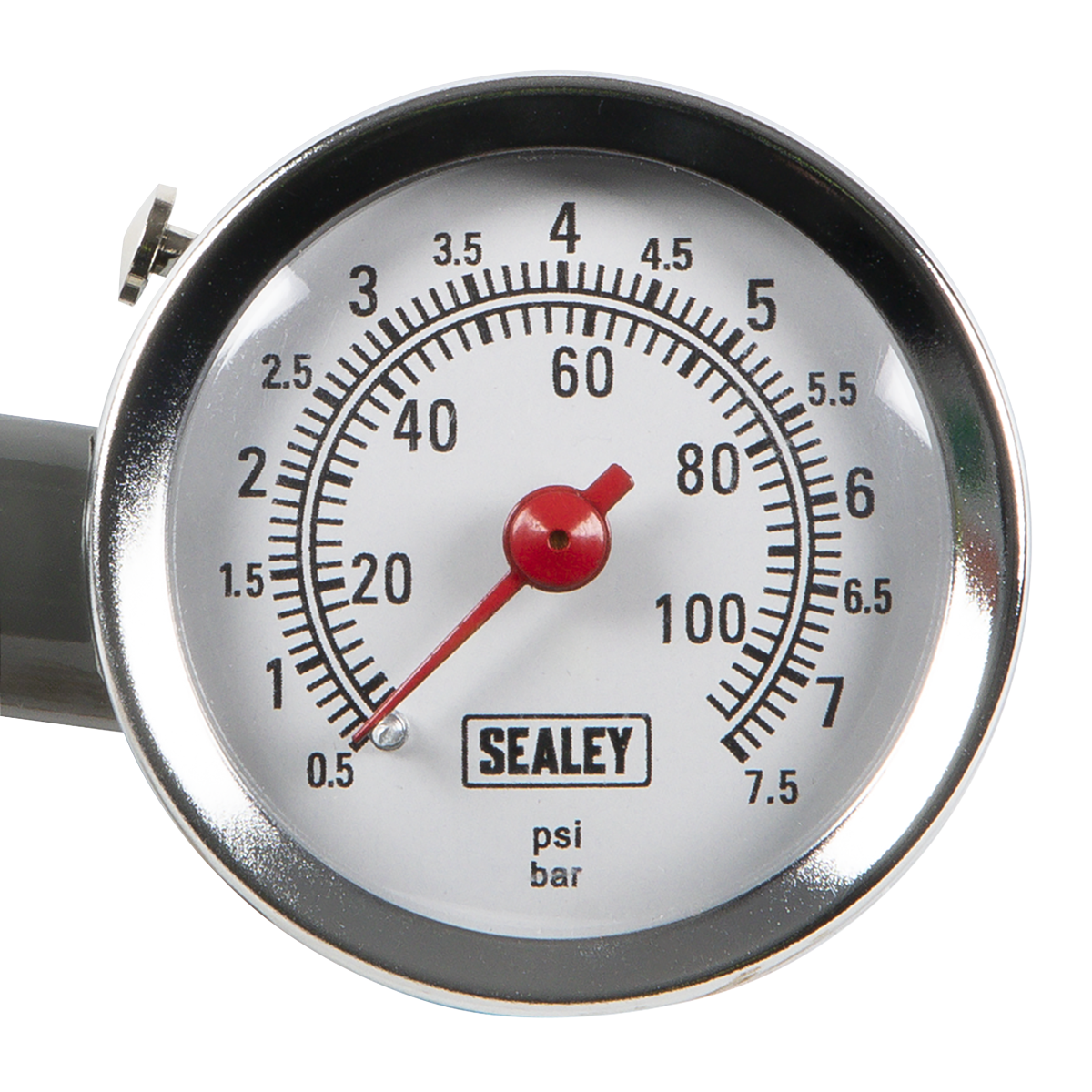 11.98 2026-01-11Pressure gauge with Ø46mm dial, reading up to 100psi(7kg/cm²). Metal body and offset valve connector. Compatible with both cars and light commercial vehicles. Supplied in a storage case.
