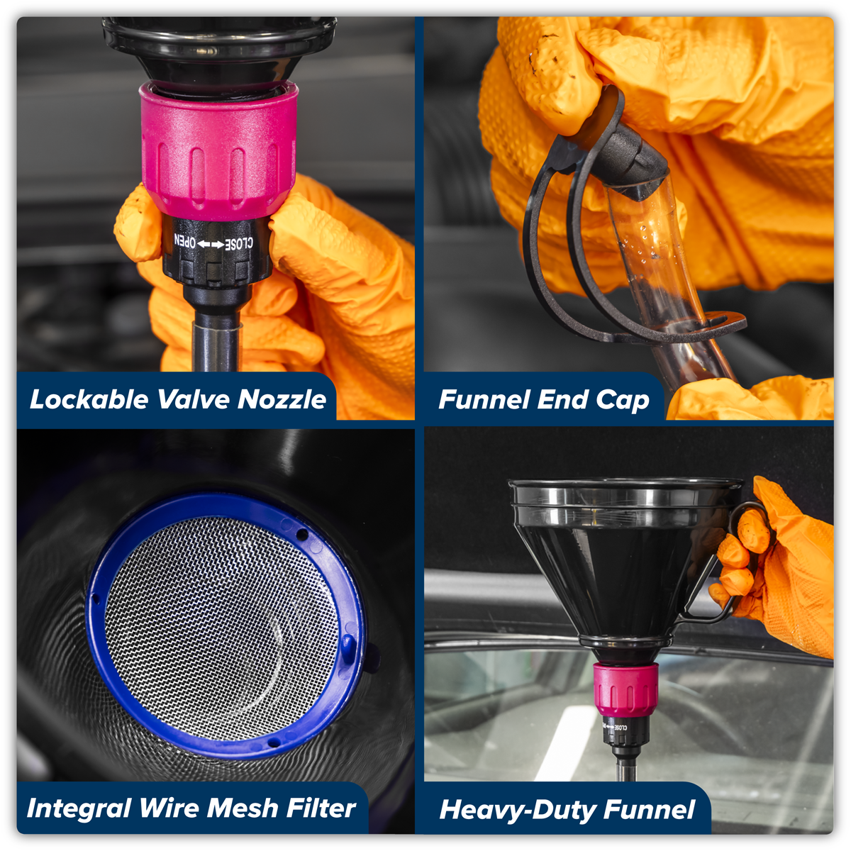17.38 2026-04-29Heavy-duty polyethylene funnel resistant to oil, fuel and some acids. Features lockable valve nozzle and integral wire mesh filter to keep contaminants out. Supplied with flexible spout with end cap. Fitted with handle for safe and easy pouring.