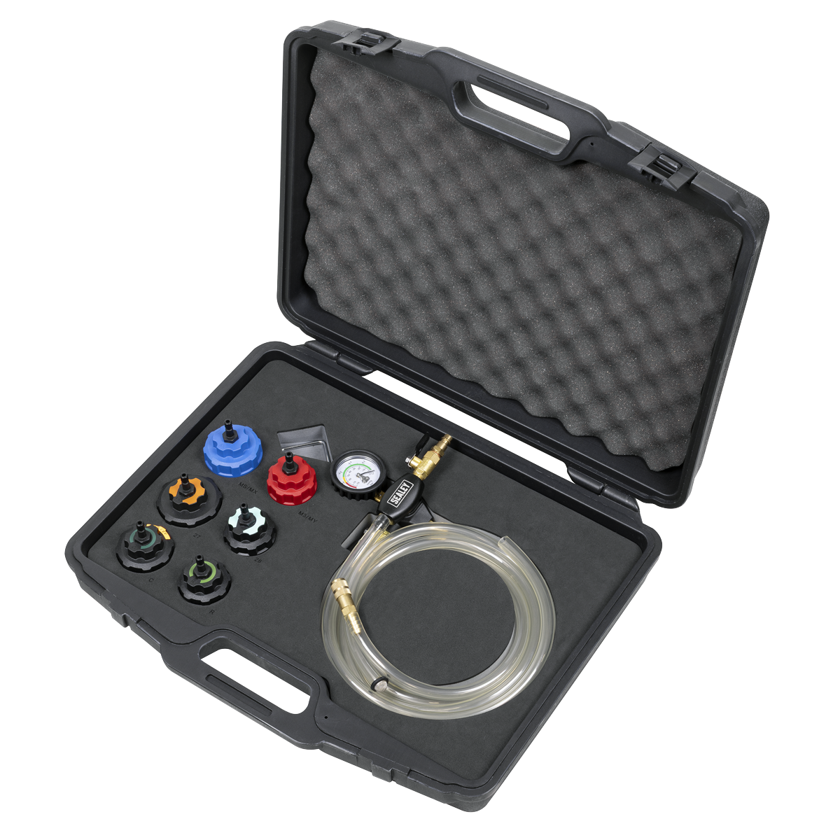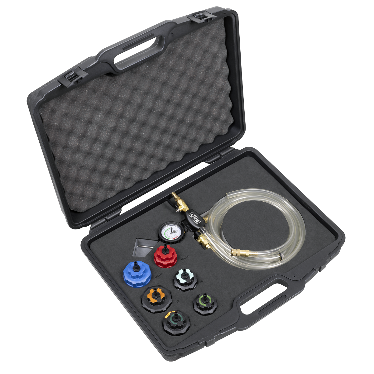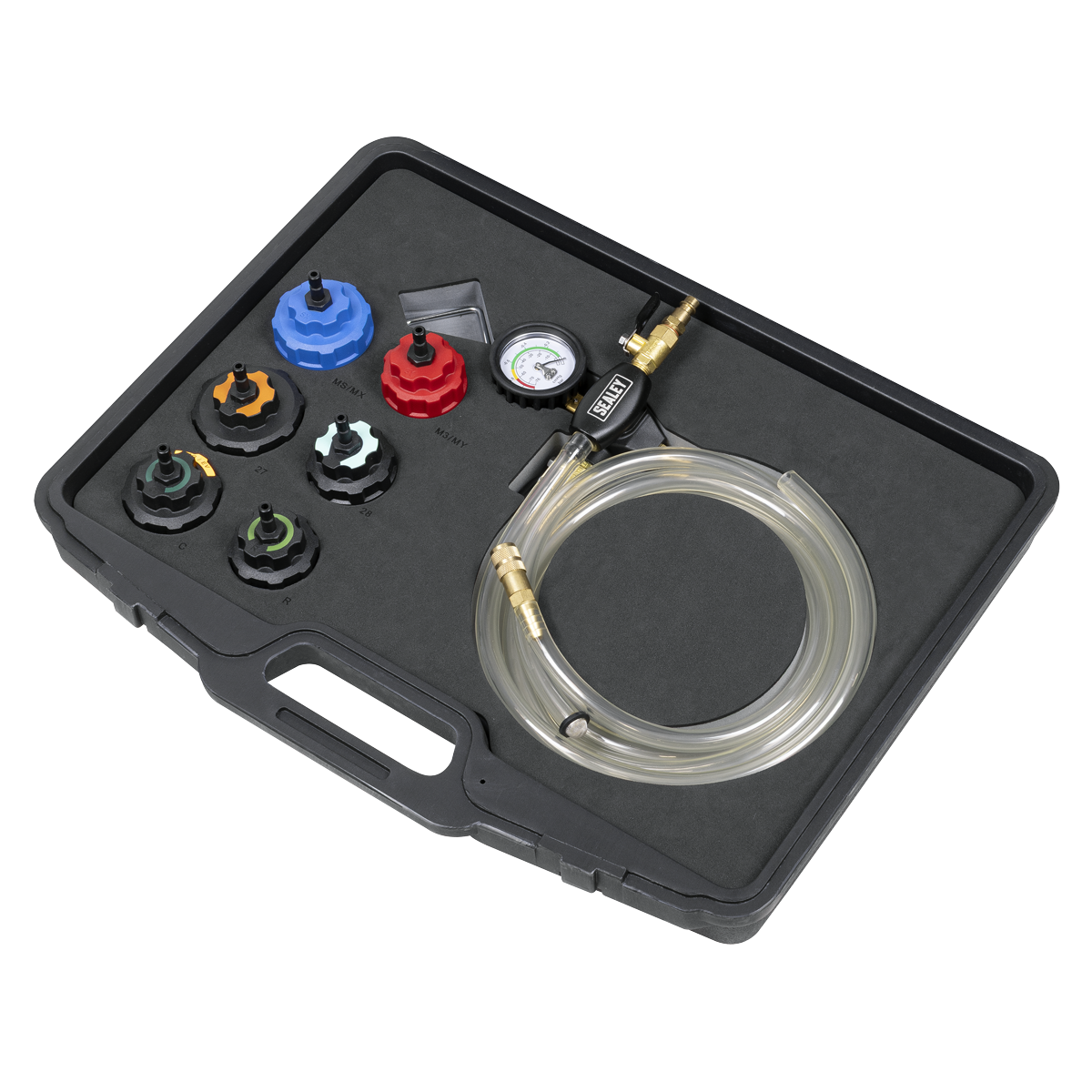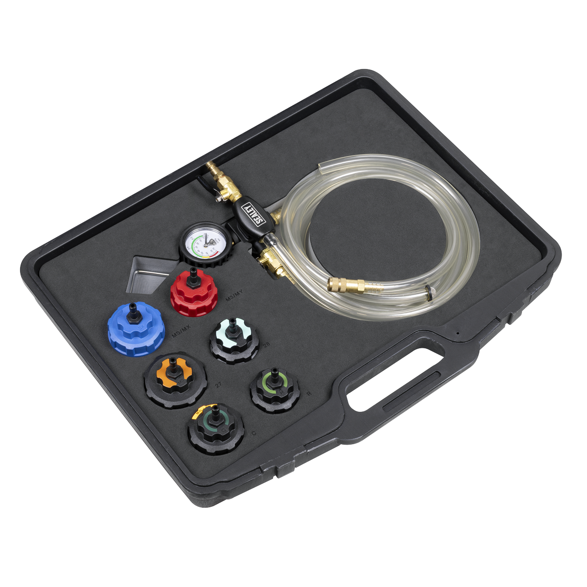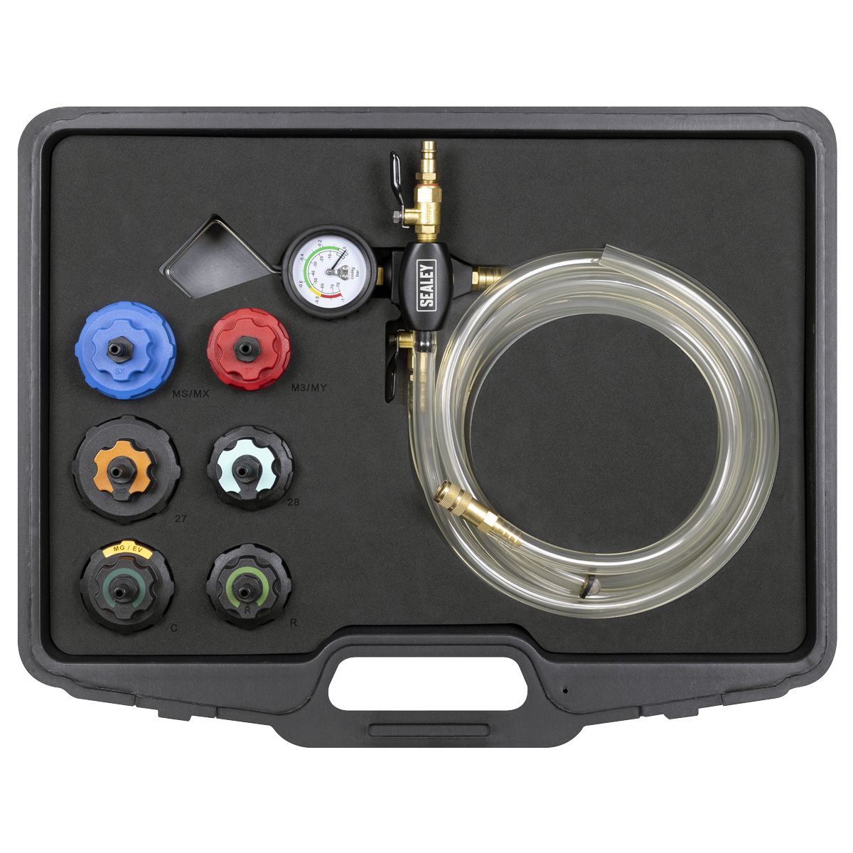 3.60 2026-05-11Dramatically reduces cooling system refill time, without mess and without introducing airlocks. No more time-consuming cooling system bleeding and no messy spills to clean up. Simply plug into the workshop air line, select appropriate cap and attach it to the cooling system header tank and create a vacuum. Hook attachment and long reach hoses provide tidy operating space. Kit includes specific caps for full electric, plug in hybrid and conventional internal combustion engines. Supplied in a storage case.