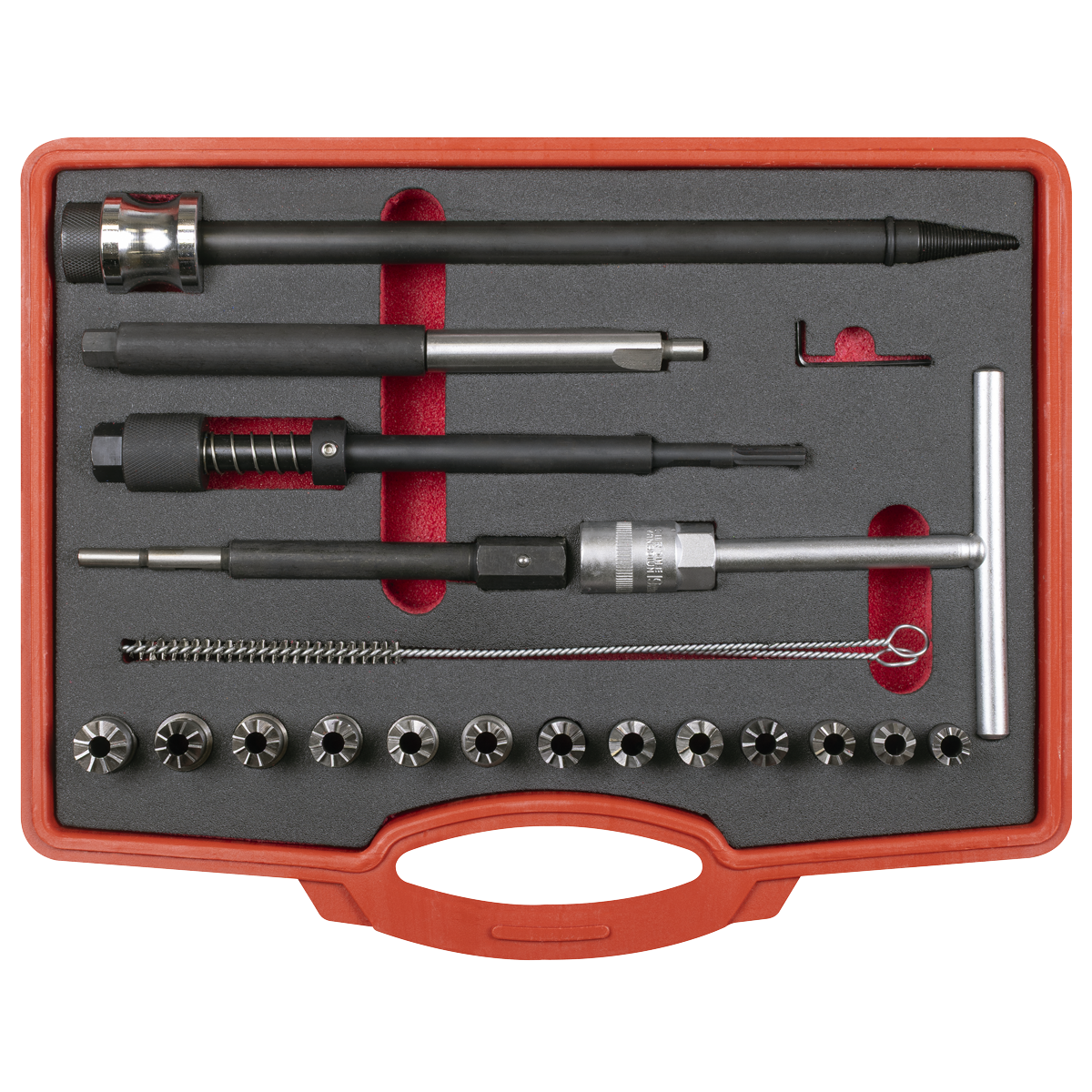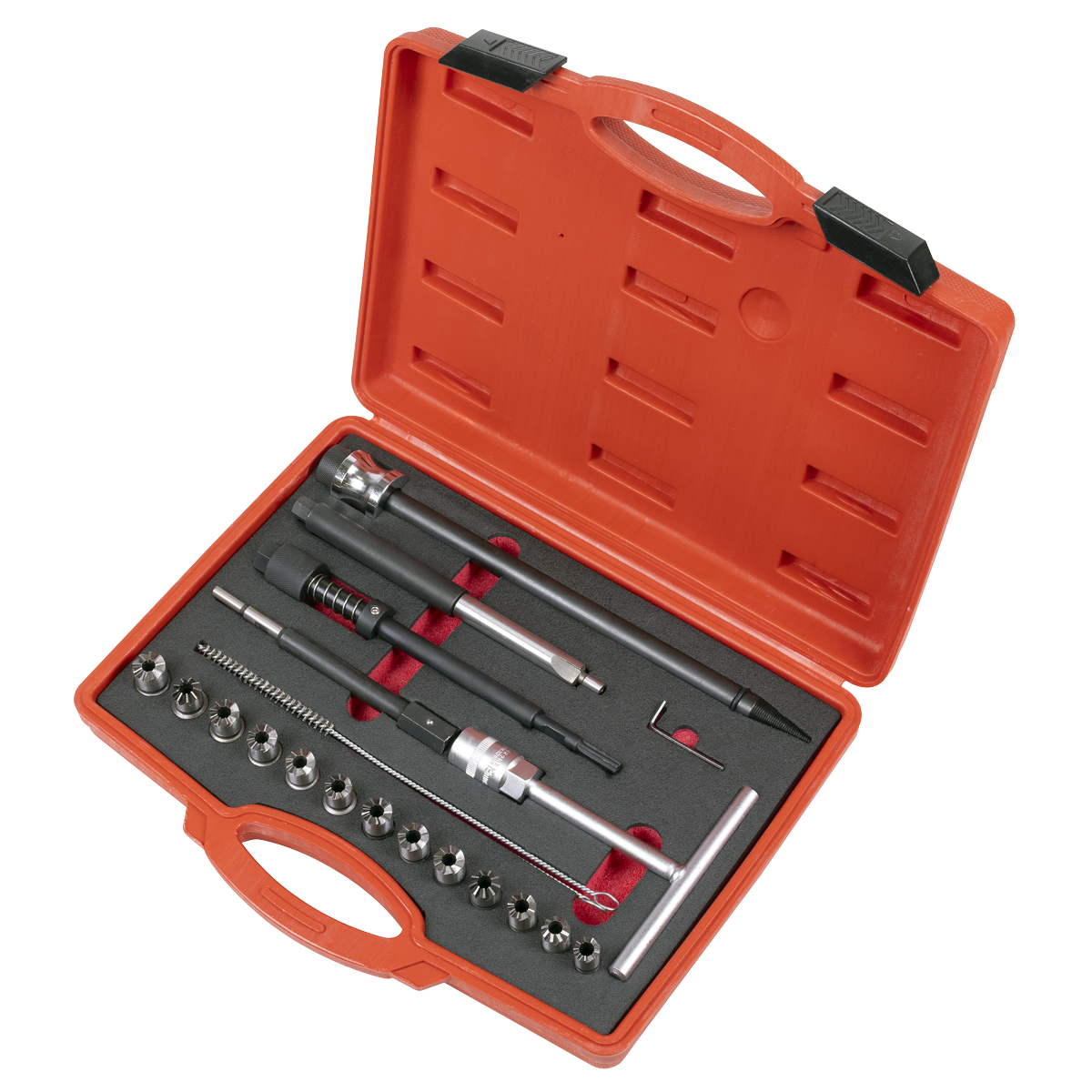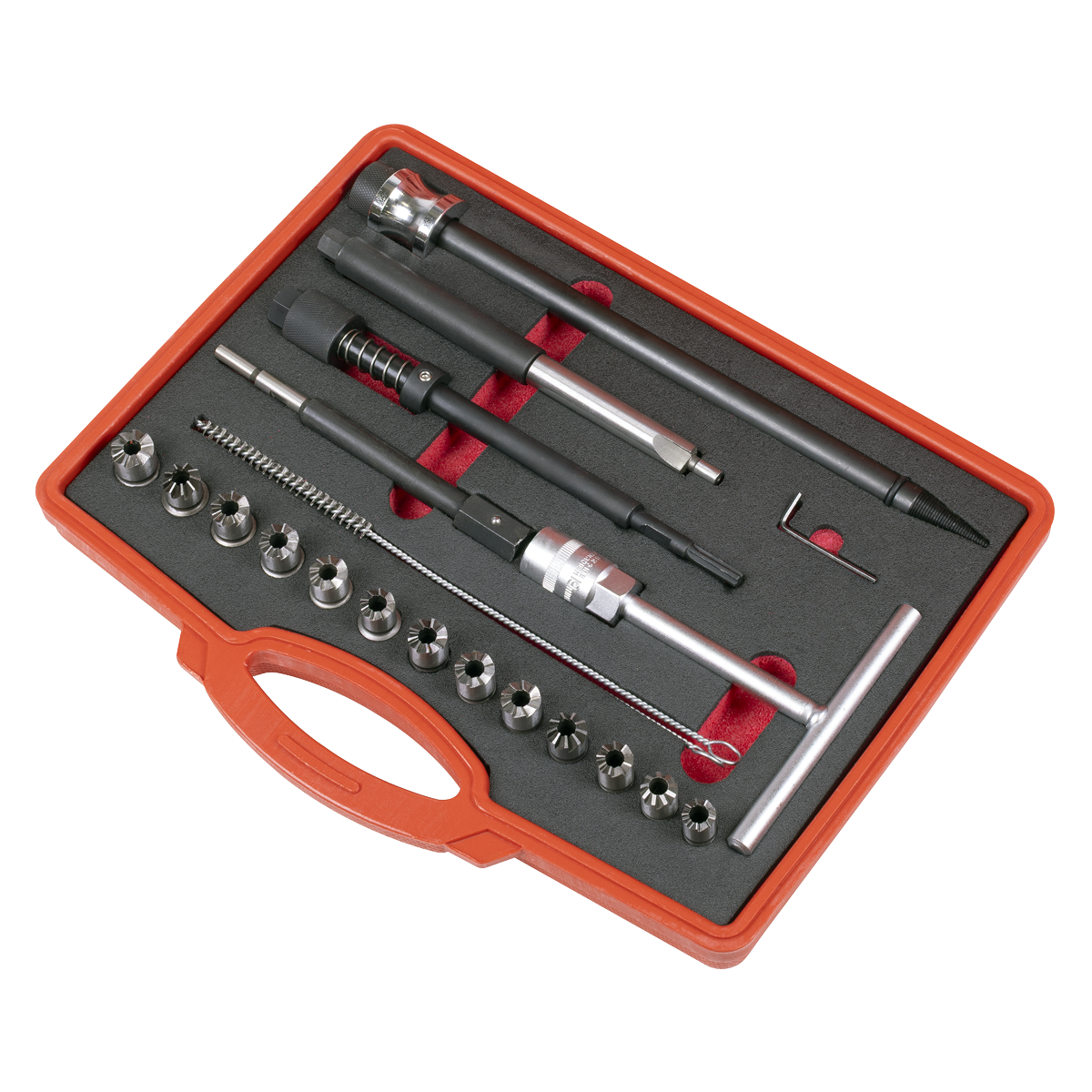 3.60 2025-12-16Comprehensive 21pc kit that fits most injector apertures. Used to clean/decarbonise injector seats when changing injectors. It helps to avoid blow-back due to poorly seated injectors. Suitable for a wide range of vehicles. Contents: Reamers: Flat Reamers; 14 x 14, 15.5 x 15.5, 15 x 19, 17 x 17, 17 x 17.5, 17 x 19, 17 x 19.5, 17 x 20, 19 x 21.5mm, Angled Reamers; 15.5 x 15.5, 17 x 17, 17 x 21, 17.5 x 20.5mm, 350mm Injector Seal Puller, T-Handle, Centring Post, Cutter, Guide Pin, 2.5mm Hex Key, Cleaning Brushes (x2).