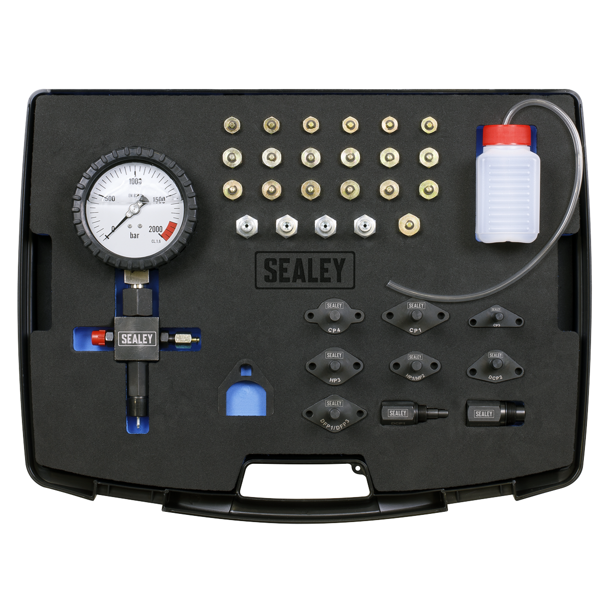 1109.95 2026-01-18Essential tool for accurately measuring the high pressure fuel circuit of diesel common rail systems. Features 2,000bar gauge, pressure relief valve and high pressure flexible hoses. The kit also includes a set of dummy pump regulator and injector pipe blanks. Kit allows for a variety of tests to be conducted: - Engine cranking/running pressure test - Maximum pump pressure test - Pump pressure regulator test - Injector leakage test