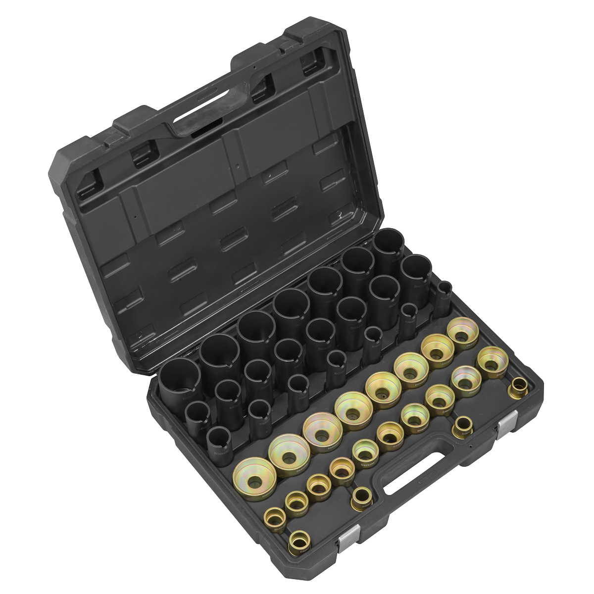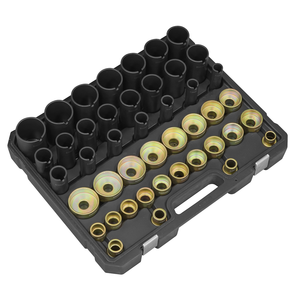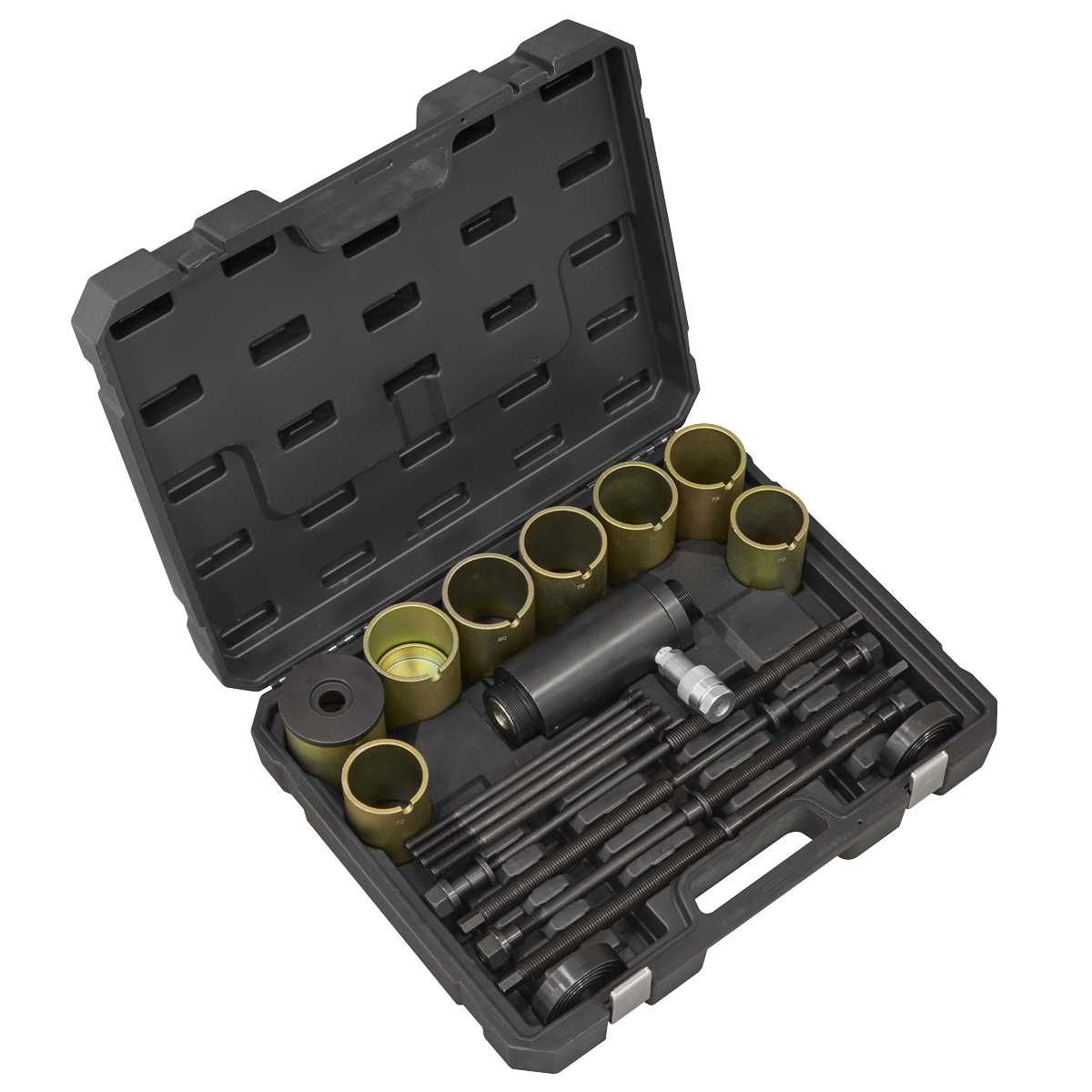 791.95 2026-01-29Designed to install and remove suspension bushes and bearings on passenger and commercial vehicles. Powerful 18 tonne hydraulic cylinder (hydraulic pump and hose not included). Compatible with Sealey air hydraulic pump RE109, hydraulic pump RE110 and hydraulic hose RE111. Protects the bush using the parallel working tension elements. The sleeve viewing window is for the correct fitment of the bush or bearing. Application: 26-82mm press sleeves in 2mm increments and an 85/87mm press sleeve. Includes four force screws and three press sleeve adaptors. Supplied in two storage cases.