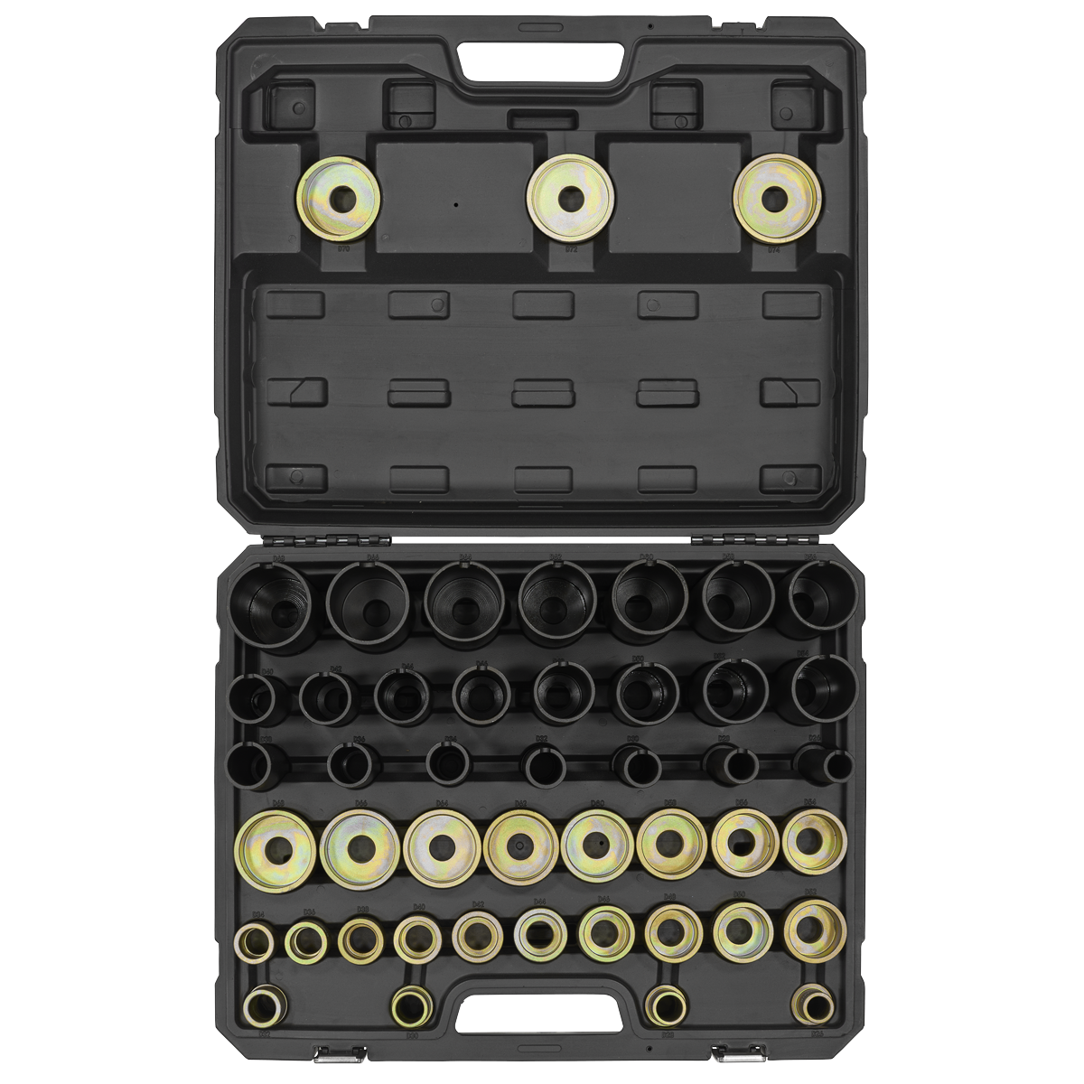 731.95 2026-05-06Designed to install and remove suspension bushes and bearings on passenger and commercial vehicles. Powerful 18 tonne hydraulic cylinder (hydraulic pump and hose not included). Compatible with Sealey air hydraulic pump RE109, hydraulic pump RE110 and hydraulic hose RE111. Protects the bush using the parallel working tension elements. The sleeve viewing window is for the correct fitment of the bush or bearing. Application: 26-82mm press sleeves in 2mm increments and an 85/87mm press sleeve. Includes four force screws and three press sleeve adaptors. Supplied in two storage cases.