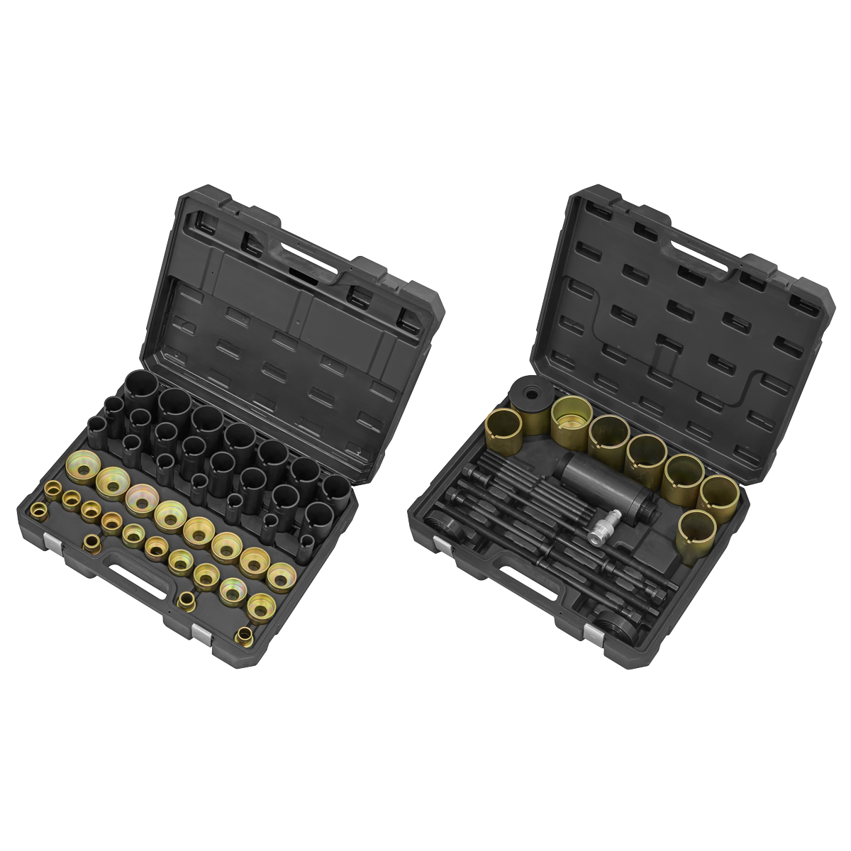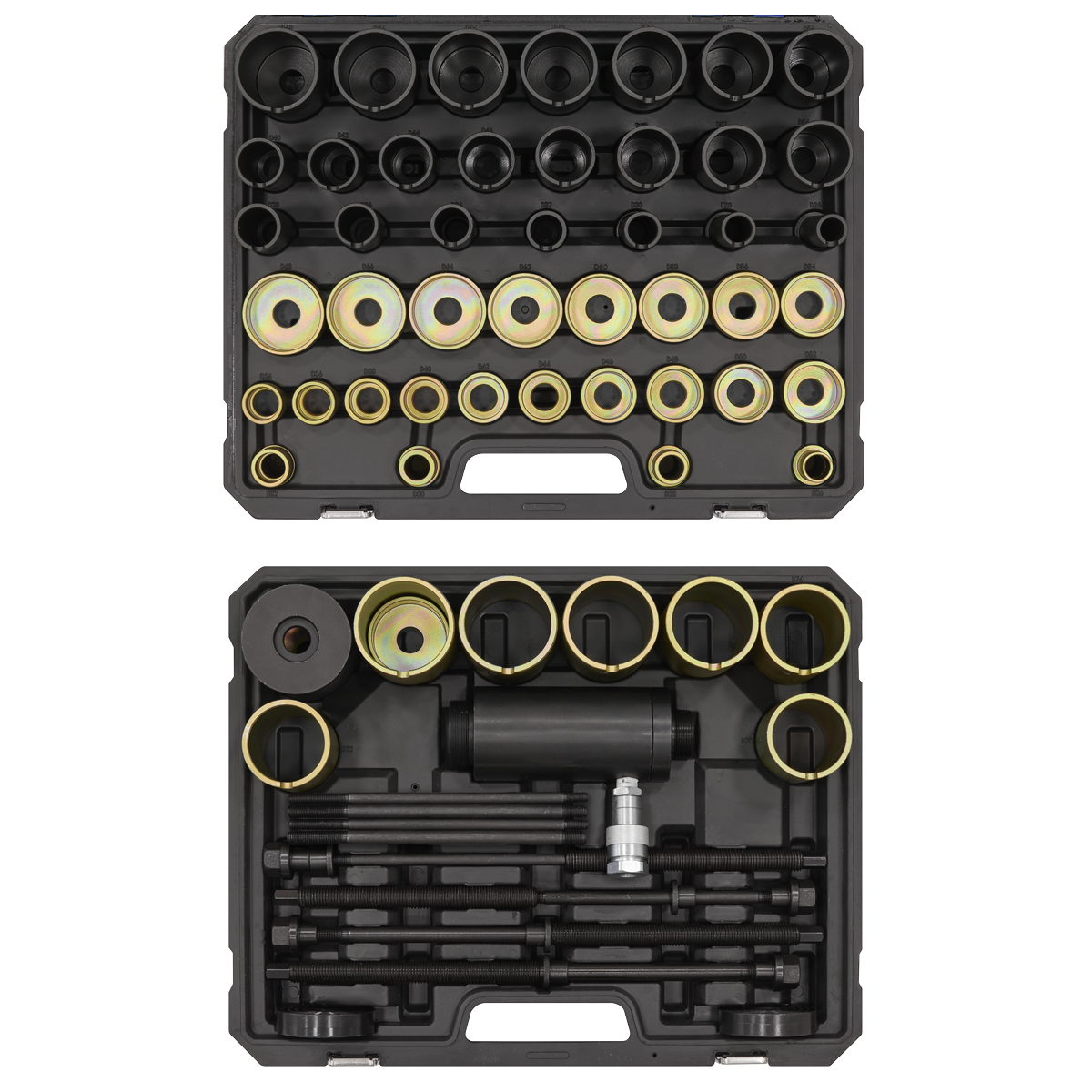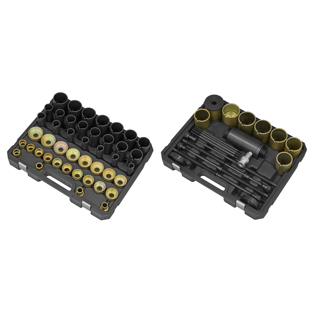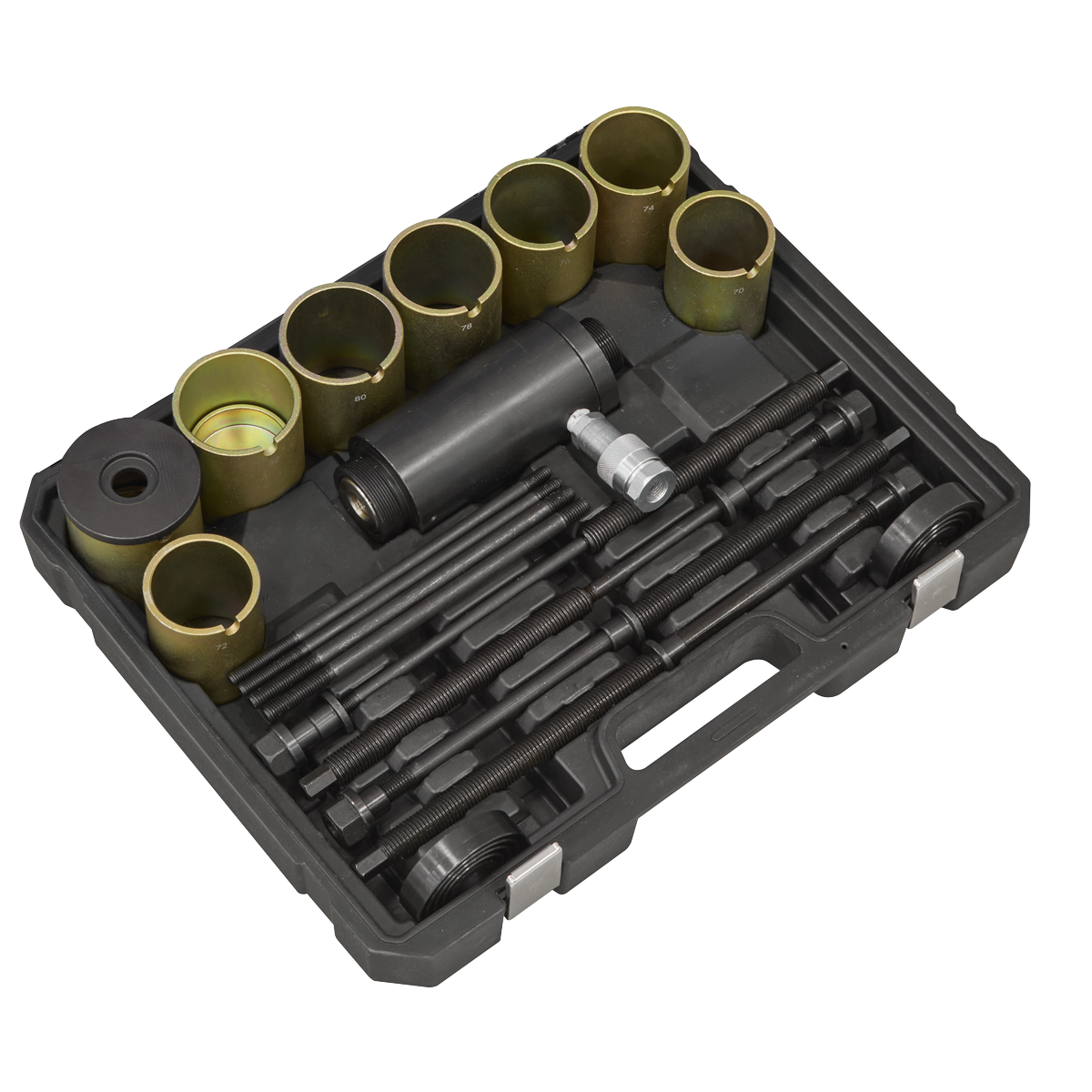 791.95 2025-12-20Designed to install and remove suspension bushes and bearings on passenger and commercial vehicles. Powerful 18 tonne hydraulic cylinder (hydraulic pump and hose not included). Compatible with Sealey air hydraulic pump RE109, hydraulic pump RE110 and hydraulic hose RE111. Protects the bush using the parallel working tension elements. The sleeve viewing window is for the correct fitment of the bush or bearing. Application: 26-82mm press sleeves in 2mm increments and an 85/87mm press sleeve. Includes four force screws and three press sleeve adaptors. Supplied in two storage cases.