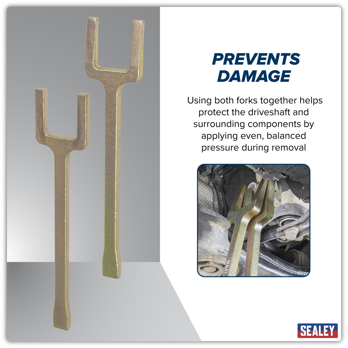 31.16 2026-04-16Designed for the quick and safe removal of driveshafts held in place with a spring clip. Fits between the gearbox and driveshaft for optimal contact and leverage. Tapered and plain fork allow even pressure to be applied. Use the forks together to prevent damage to the driveshaft and surrounding components. Jaw width: 49mm. Length: 350mm.