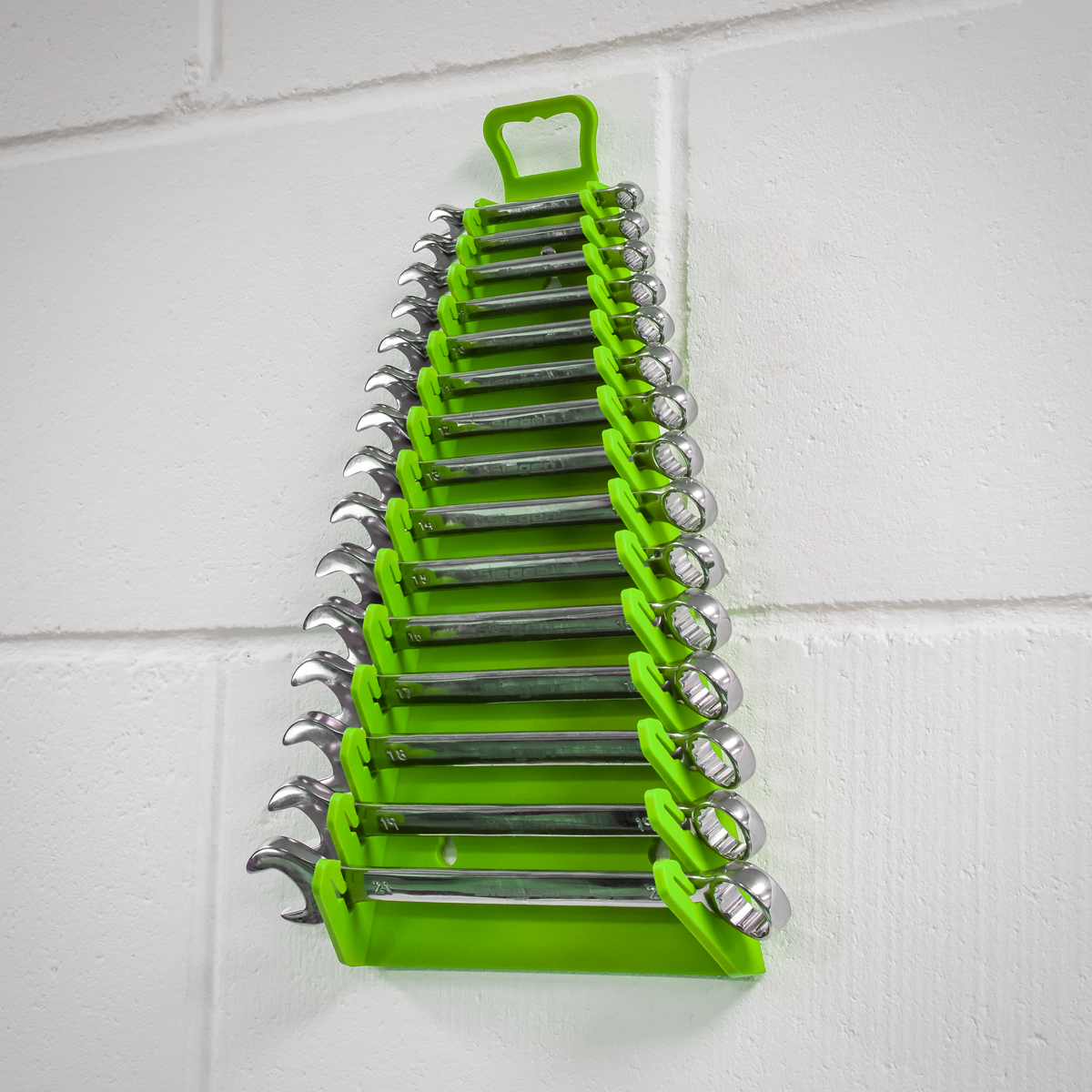 15.58 2025-12-01Soft, non-marking TPR material spanner rack helps maintain an organised toolbox or workstation. Securely holds up to 15 spanners for easy size identification. Can also be carried or wall mounted. Solvent and fuel resistant.