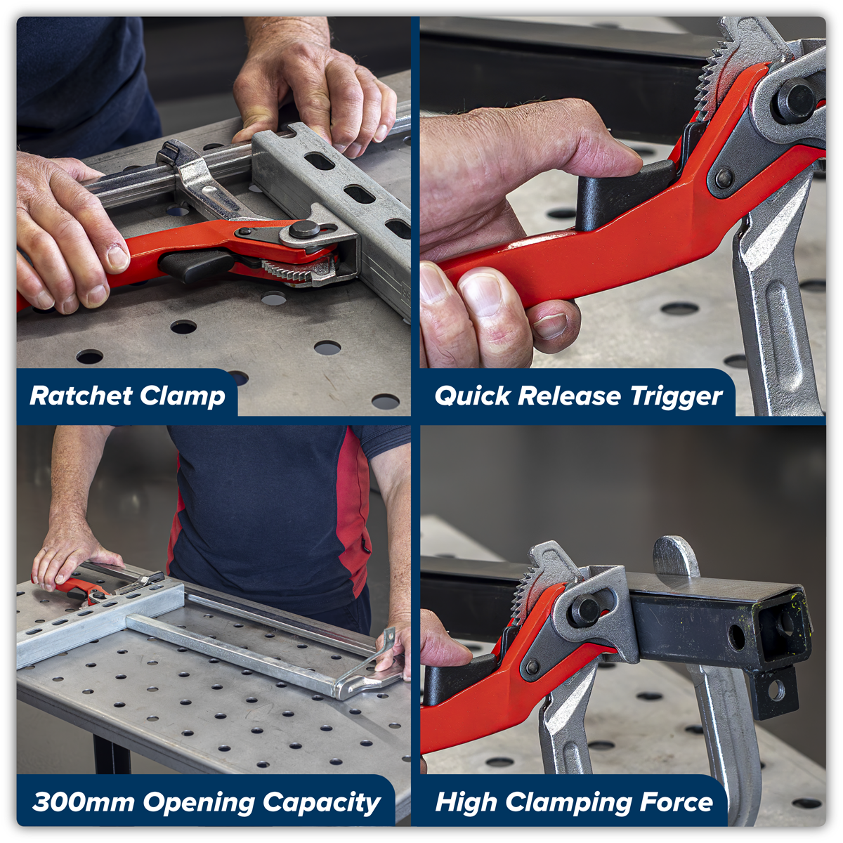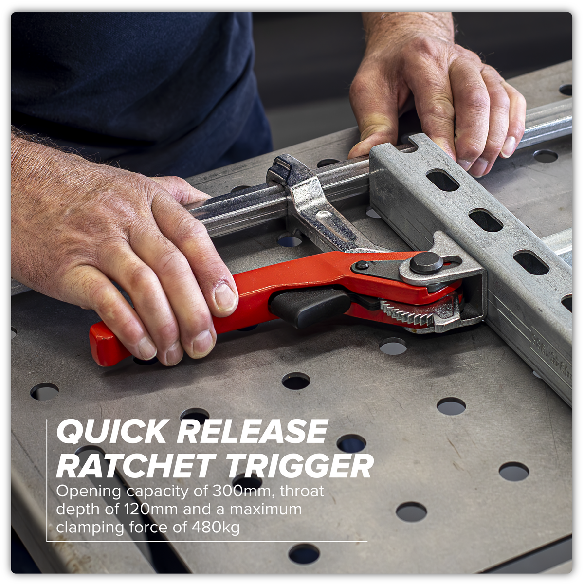41.06 2026-01-24Quick Ratcheting clamp with easy release trigger. Maximum clamping force of 480kg. Opening capacity of 300mm, throat depth of 120mm.