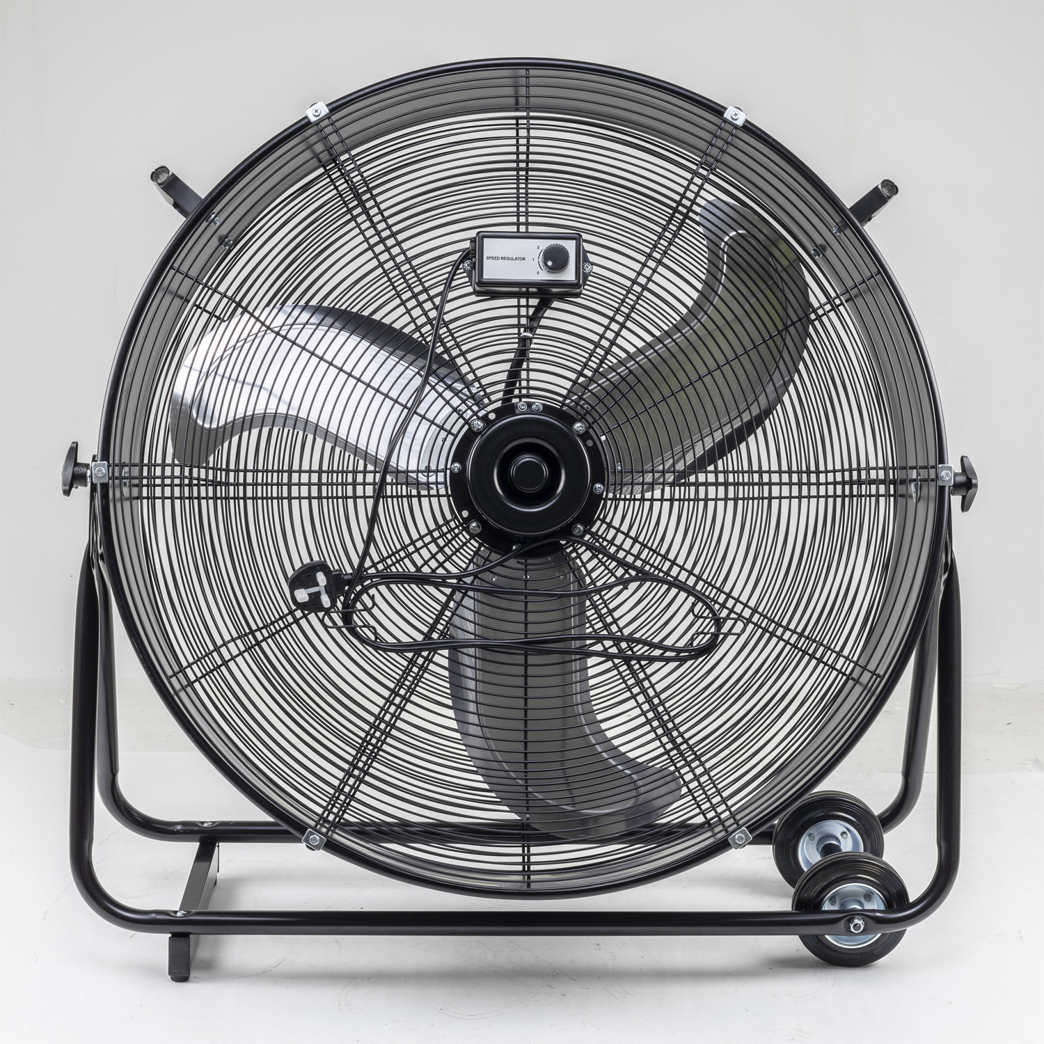 Wheel-mounted on a cradled steel frame, the drum enclosed, heavy-duty 3-blade fan can be rotated between 360° on its vertical axis to maximise airflow coverage.