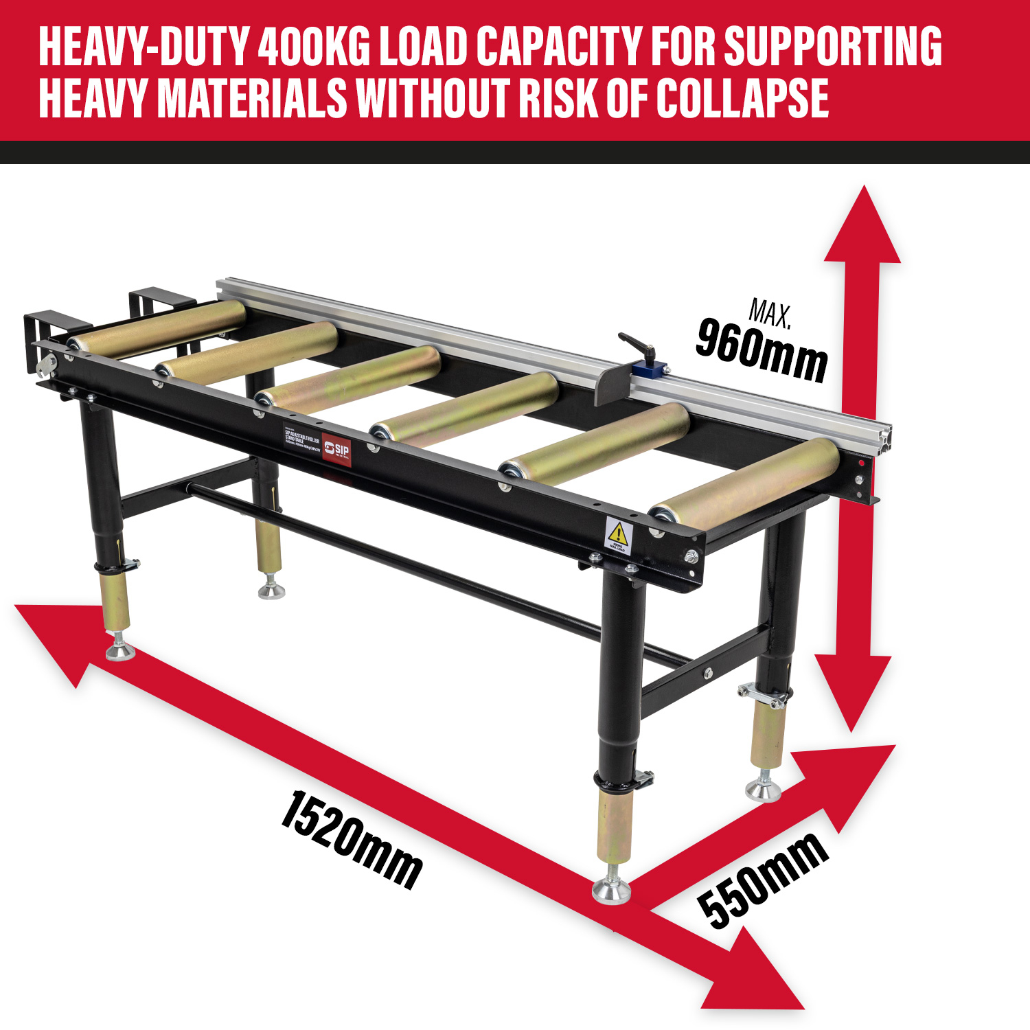 What's in the box?: 1x SIP Adjustable Roller Stand Table, 4x short legs (480mm to 840mm), 4x long legs (600mm to 960mm), 1x 50mm material stop with flip stop, 2x mounting brackets and 3x spirit level indicators.