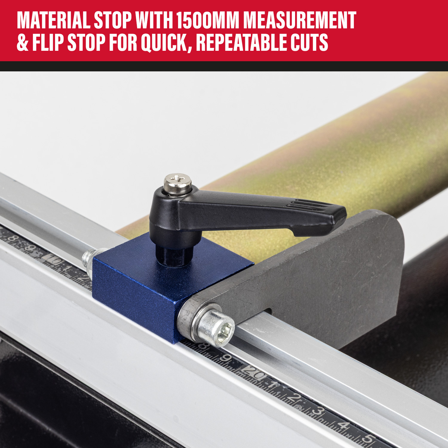 MATERIAL STOP WITH 1500MM MEASUREMENT SCALE & FLIP STOP FOR QUICK, REPEATABLE CUTS