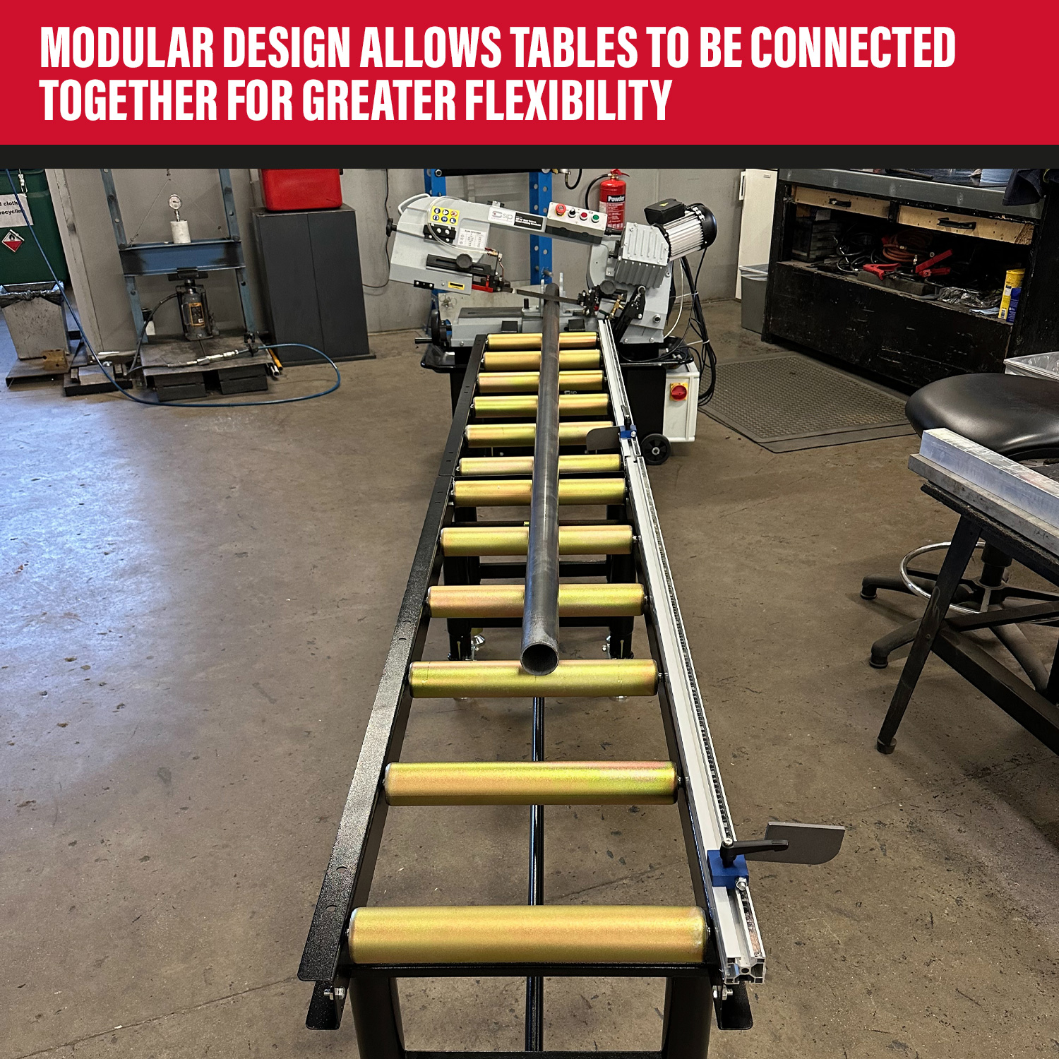 Featuring height adjustable legs to precisely match the working height of metal-cutting bandsaws, other machinery and workbenches, it's modular design allows for multiple tables to be connected together for greater flexibility.