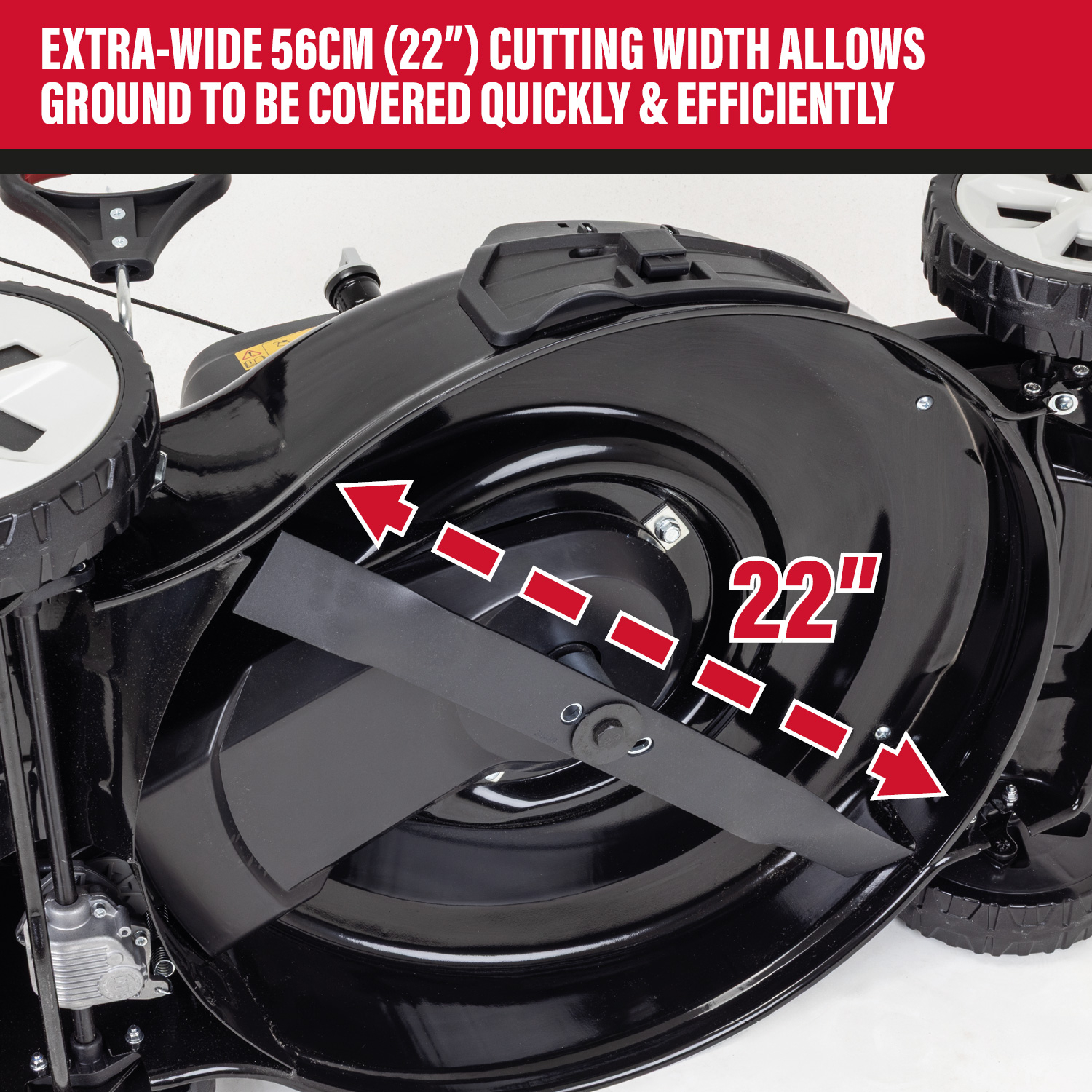 EXTRA-WIDE 56CM (22") CUTTING WIDTH ALLOWS GROUND TO BE COVERED QUICKLY & EFFICIENTLY WHILE REMAINING MANOEUVRABLE