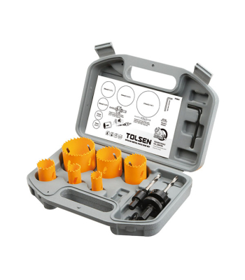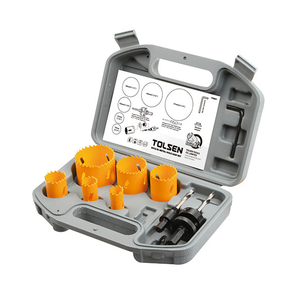 33.96 2026-01-17Bi-metal Hole Saw Set 9PCS. Contents:. 6PCS Hole saw: 3/4 inch (19mm), 7/8 inch (22mm), 1-1/8 inch (29mm), 1-1/2 inch (38mm), 1-3/4 inch (44mm), 2-1/4 inch (57mm). 2PC Arbors:. 3/8 inch (9.5mm) Hex shank arbor with HSS polit drill for 1/2 inch -1-3/16 inch (14-30mm) hole saw. 7/16 inch (11mm) Hex shank arbor with HSS polit drill for 1-1/4 inch - 8-17/64 inch (32-210mm) hole saw. 1PC adapter.