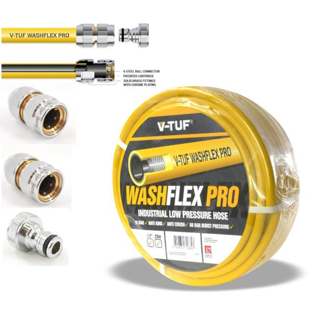 The V-TUF WASHFLEX PRO WATER HOSE BF12 – is a popular anti kink industrial hose pipe (an ideal pressure washer feed hose). It is also used in Agricultural & Horticultural hose applications, such as drag lines, watering and by the discerning user as quality garden hose. WASHFLEX PRO WATER HOSE BF12 is a WINNER due to its durability, flexibility, wear resistant outer skin and anti-crush design. - WASHFLEX PRO WATER HOSE has a working pressure of 10 bar ideal hose to connect to taps with standard mains pressure or low pressure . The hose has been tested to burst at 50 bar (five times the recommended working pressure). - The internal diameter of the WASHFLEX BF12 hose is 12.5mm and the outside diameter is 17.5mm. - WASHFLEX BF12 hose is compatible with DURAKLIX KCQ , NSQ , GKC and Hozelock style fittings which fit the Tricoflex and Hozelock anti kink hose. - WASHFLEX BF12 is highly flexible with an excellent bend radius and remains flexible in freezing conditions. - WASHFLEX BF12 is Phthalate Free, Phenol Free, Phytotoxic Free Material (Plant Friendly material) and is made from virgin materials which is the secret of its durability. - The WASHFLEX BF12 is REACH approved which ensure that the water and environment is not contaminated. - WASHFLEX BF12 is manufactured in Great Britain