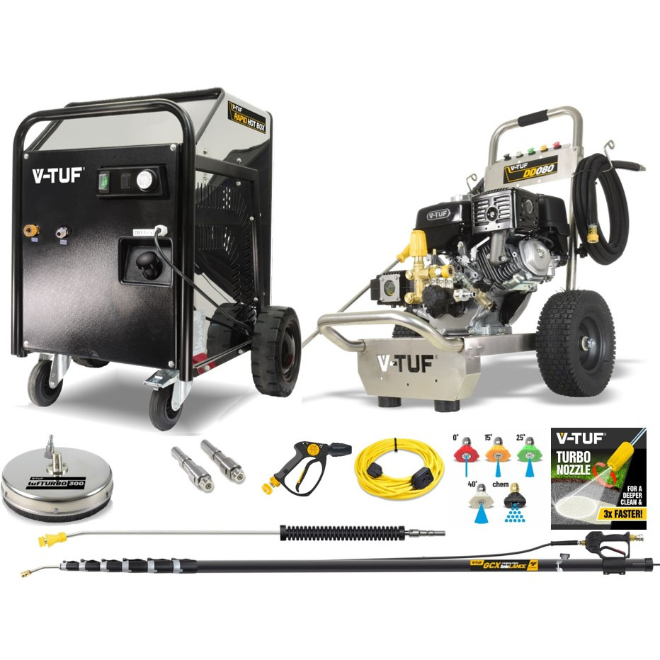 The V-TUF DD080 direct drive pressure washer makes the most demanding of cleaning tasks easy, effective, and effortless. With a high volume of power of 2900 psi (200 Bar), 15L/Min, from a petrol 9HP Honda Engine, this cleaning workhorse has proven extremely popular for all-day demanding cleaning jobs.