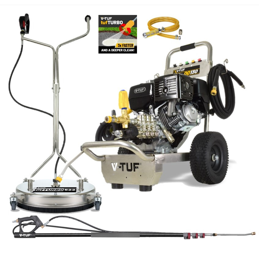 The V-TUF DD130 makes the most demanding of cleaning tasks easy, effective, and effortless. With a high volume of power of 4350 psi (300 Bar) Max, 15L/Min, from a petrol 13HP Honda Engine, this formidable cleaning workhorse has proven extremely popular for those demanding cleaning jobs. This is a similar machine to the Torrent 3 but has an upgraded pump and Engine.