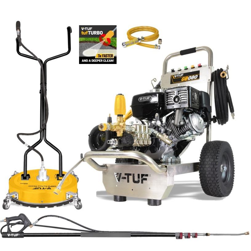 The V-TUF GB080 gearbox driven pressure washers make the most demanding of cleaning tasks easy, effective, and effortless. With a high volume of power of 2900 psi (200 Bar), 15L/Min, from a petrol 9HP Honda Engine, this formidable cleaning workhorse has proven extremely popular for those demanding cleaning jobs.