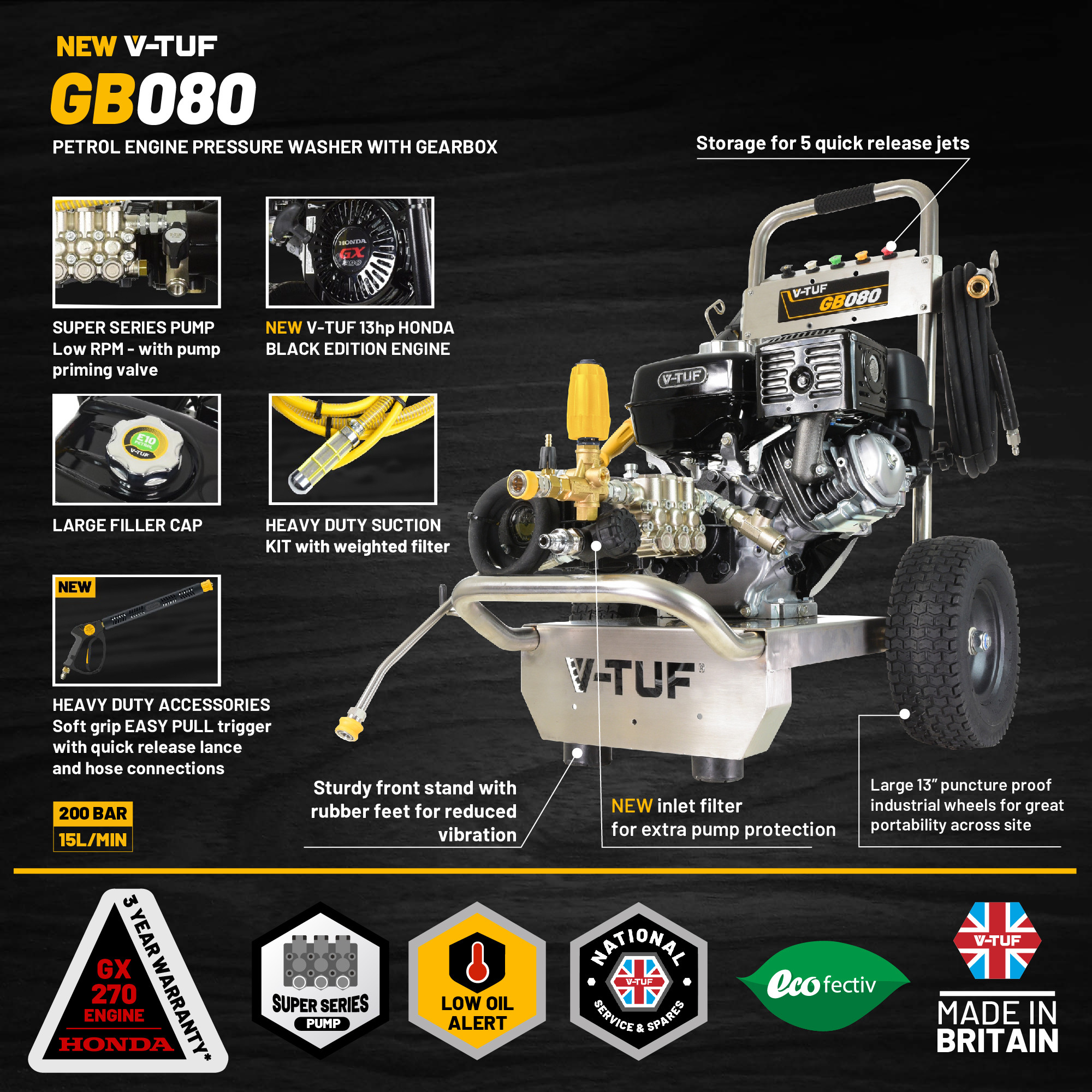 GB080 industrial power washers have been developed off the back of popular market needs to handle the toughest cleaning jobs with ease, providing a simple to use, mobile, compact, and reliable pressure washer. Using a V-TUF pressure washer with a gearbox greatly increases the life of the pump, and all the wearing parts, saving you time and money on the long-term maintenance.