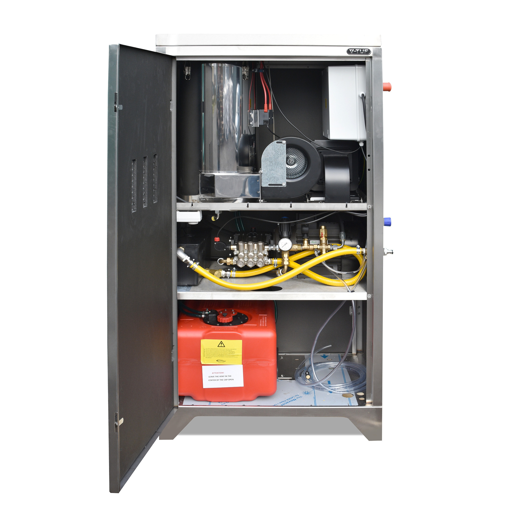 V-TUF RAPID SXL 21/150 Stainless Steel cabinet HOT high pressure washer. Performance: high flow 21 litres per minute at 2000PSI (150BAR) operating pressure (200Bar rated pump). Ideal to feed fixed pipework systems. The V-TUF RAPID SXL has been developed with pressure washer owners and users to the correct specification to cope in demanding conditions such as: weather, multi operator issues and theft issues.